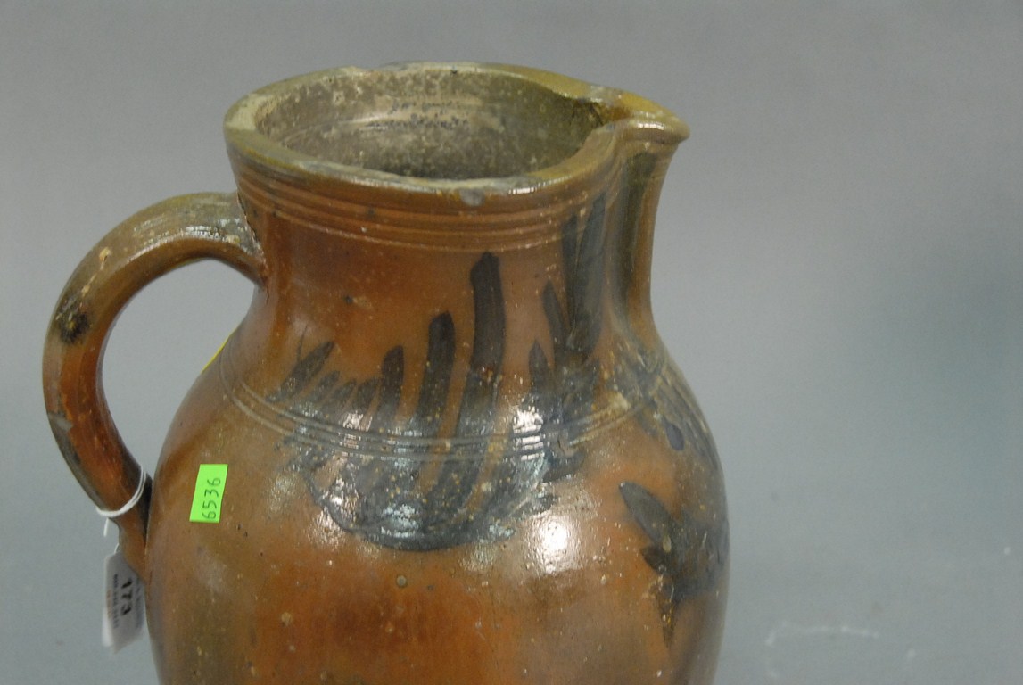 Lot 173: Stoneware two gallon jug with blue decoration. ht. 13 1/2in. Being sold to benefit a Connecticut Museum.