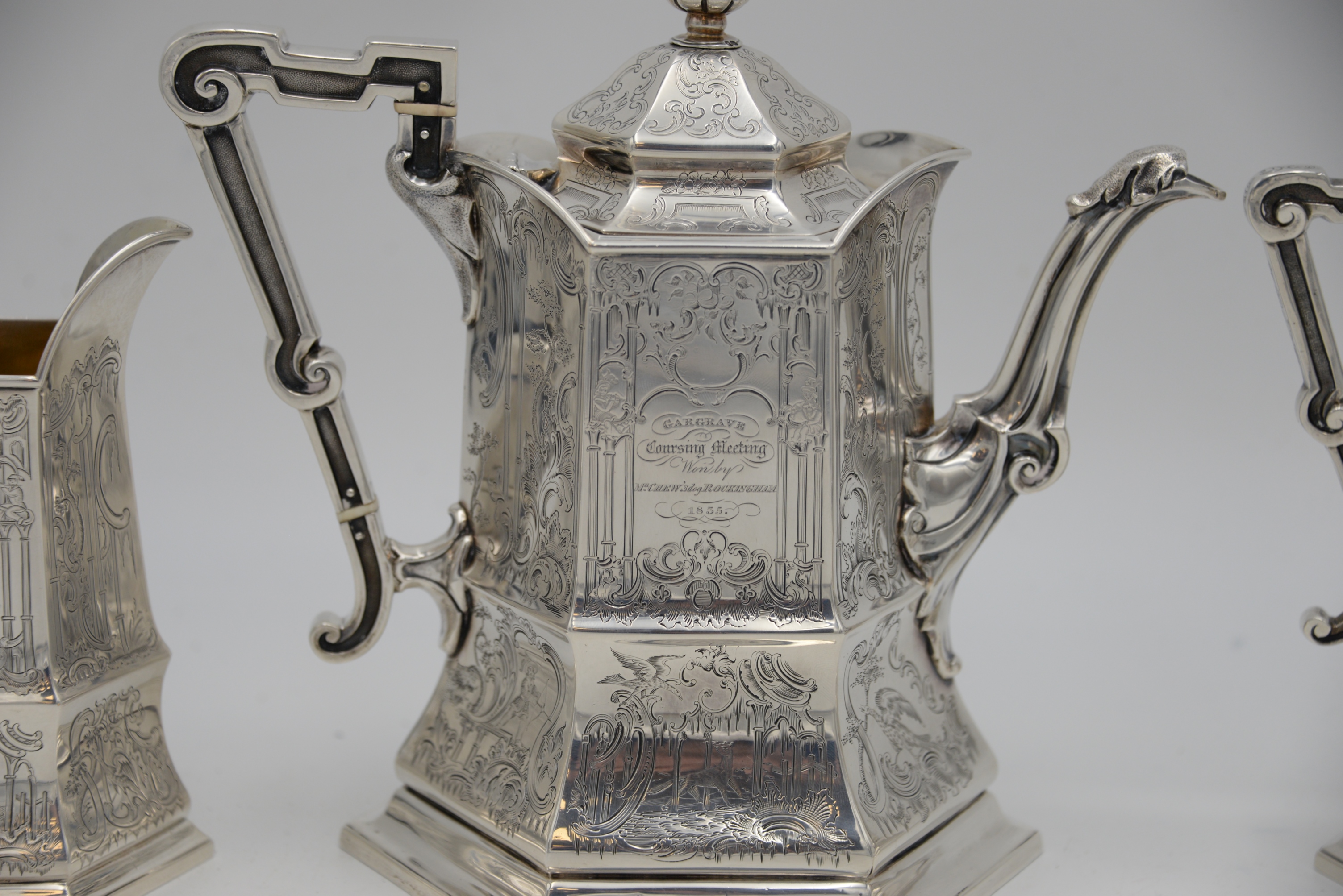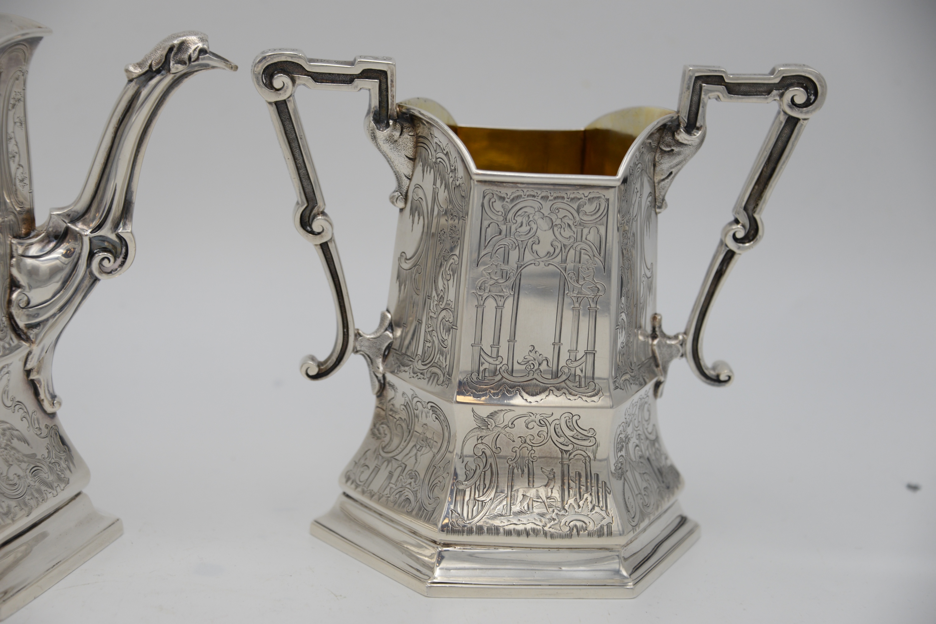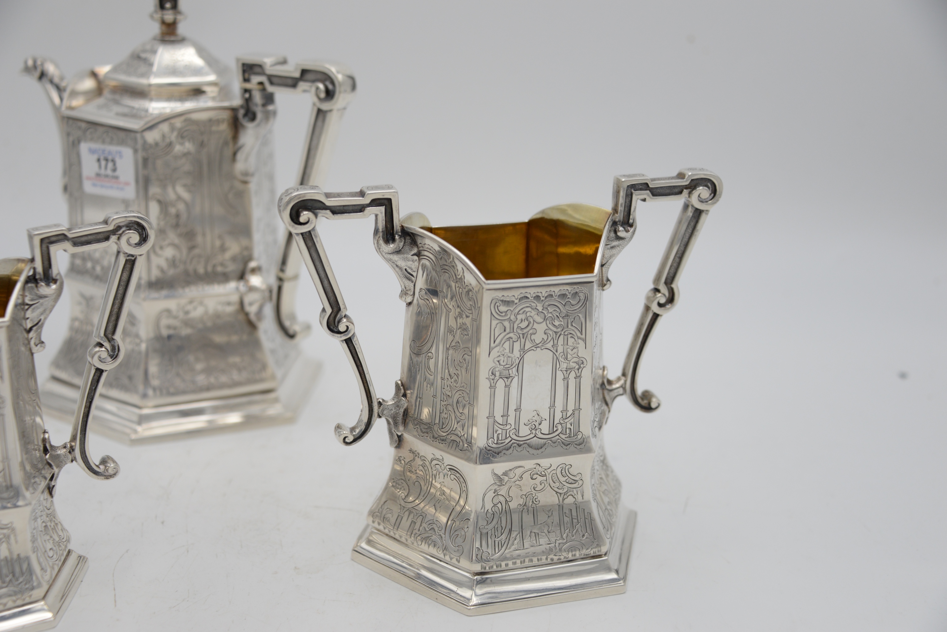 Three Piece George IV Silver Tea Set, in Gothic taste, having teapot, creamer and sugar, all with panels of pillars, musicians, birds, animals, hunter and trees with vermeil interiors, inscribed “Gargrave Coursing Meeting Won by Mr. Chews Dog, Rockingham 1835”, heights 6 – 9 1/4 inches, 53.4 t.oz.