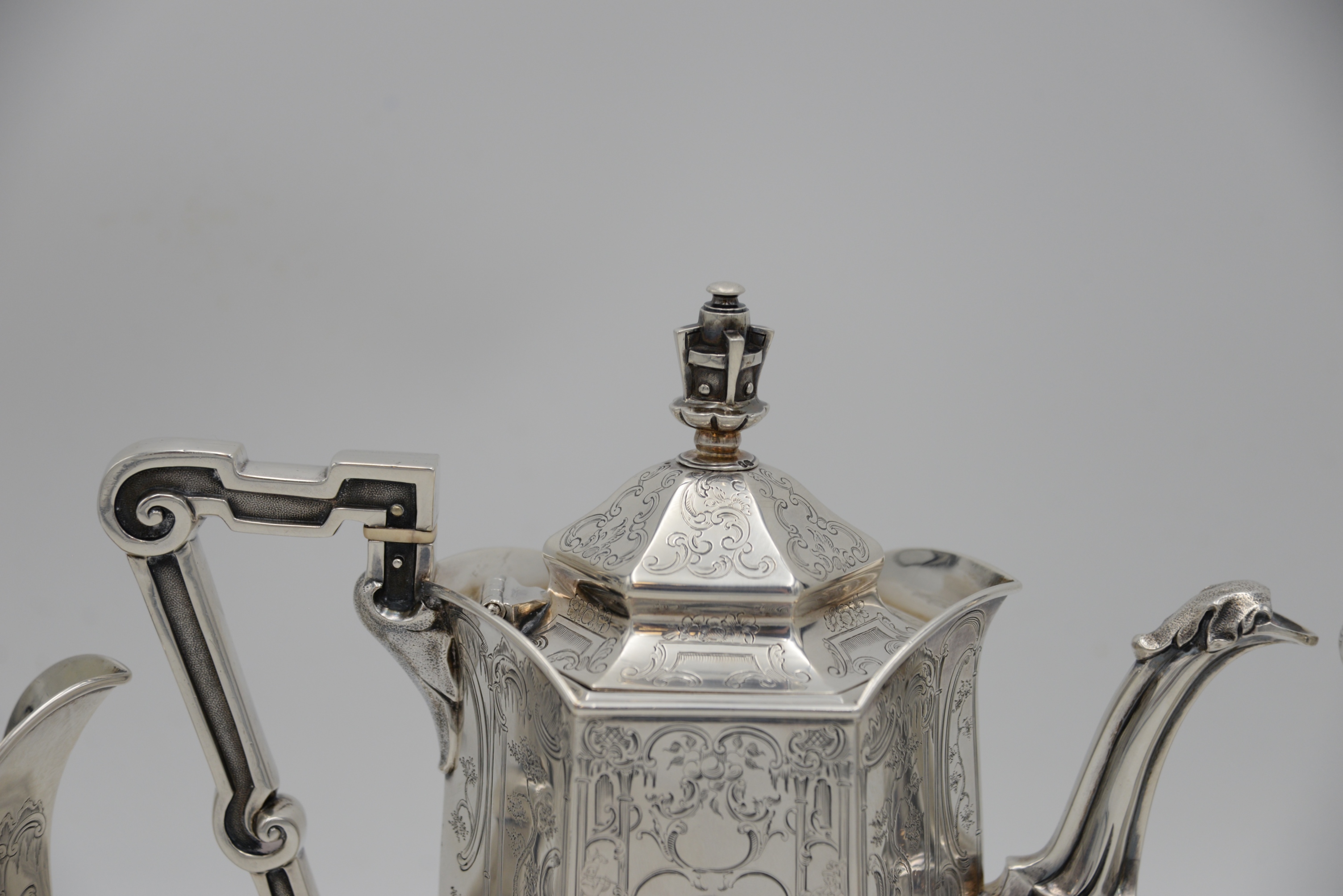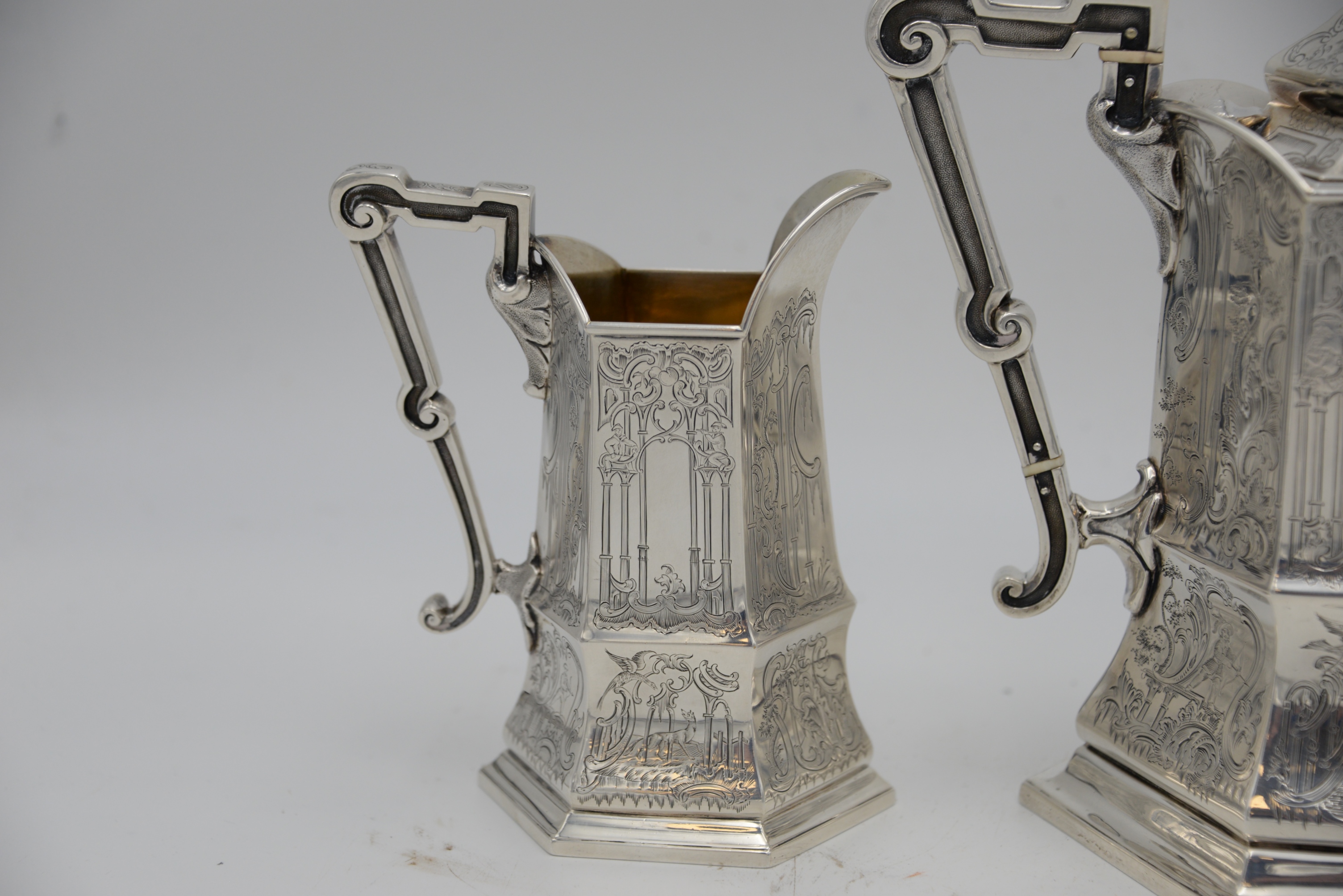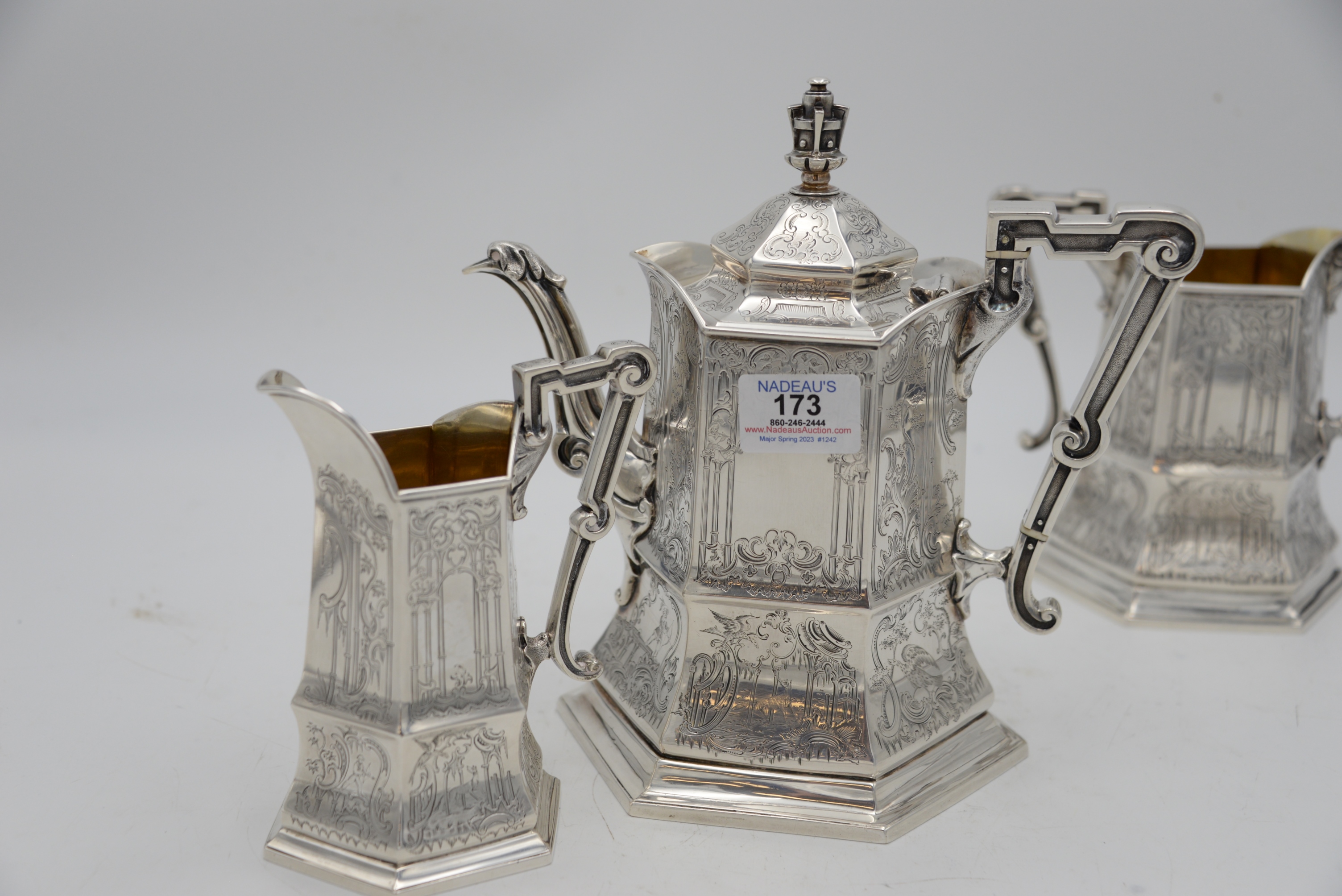 Three Piece George IV Silver Tea Set, in Gothic taste, having teapot, creamer and sugar, all with panels of pillars, musicians, birds, animals, hunter and trees with vermeil interiors, inscribed “Gargrave Coursing Meeting Won by Mr. Chews Dog, Rockingham 1835”, heights 6 – 9 1/4 inches, 53.4 t.oz.