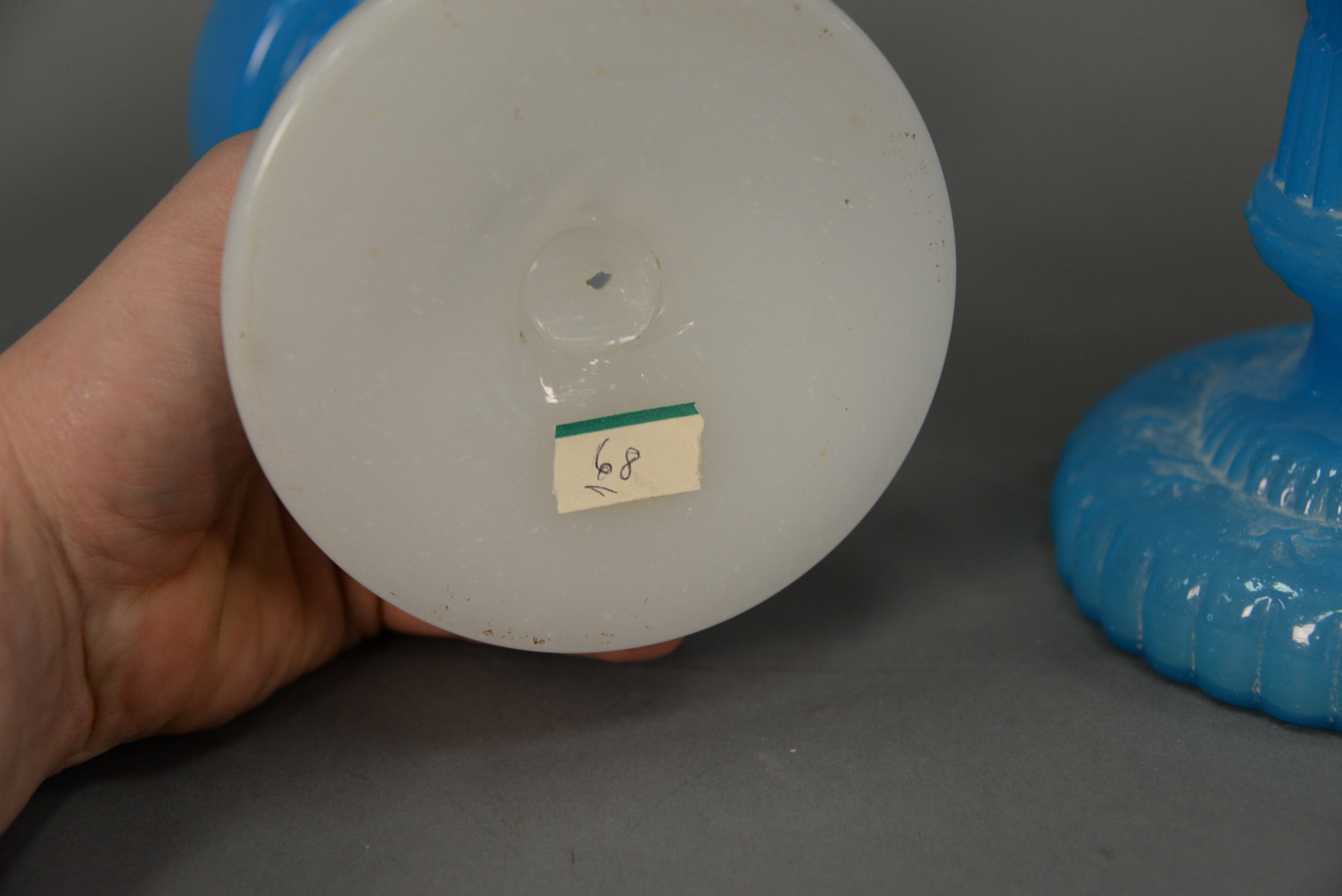 Lot 173: Two 19th century oil lamps including Clambroth and Blue opaline glass oil lamp and an opaline oil lamp. ht. 8 in. & 11 1/2 in.