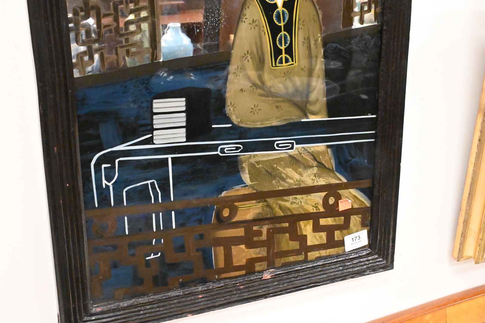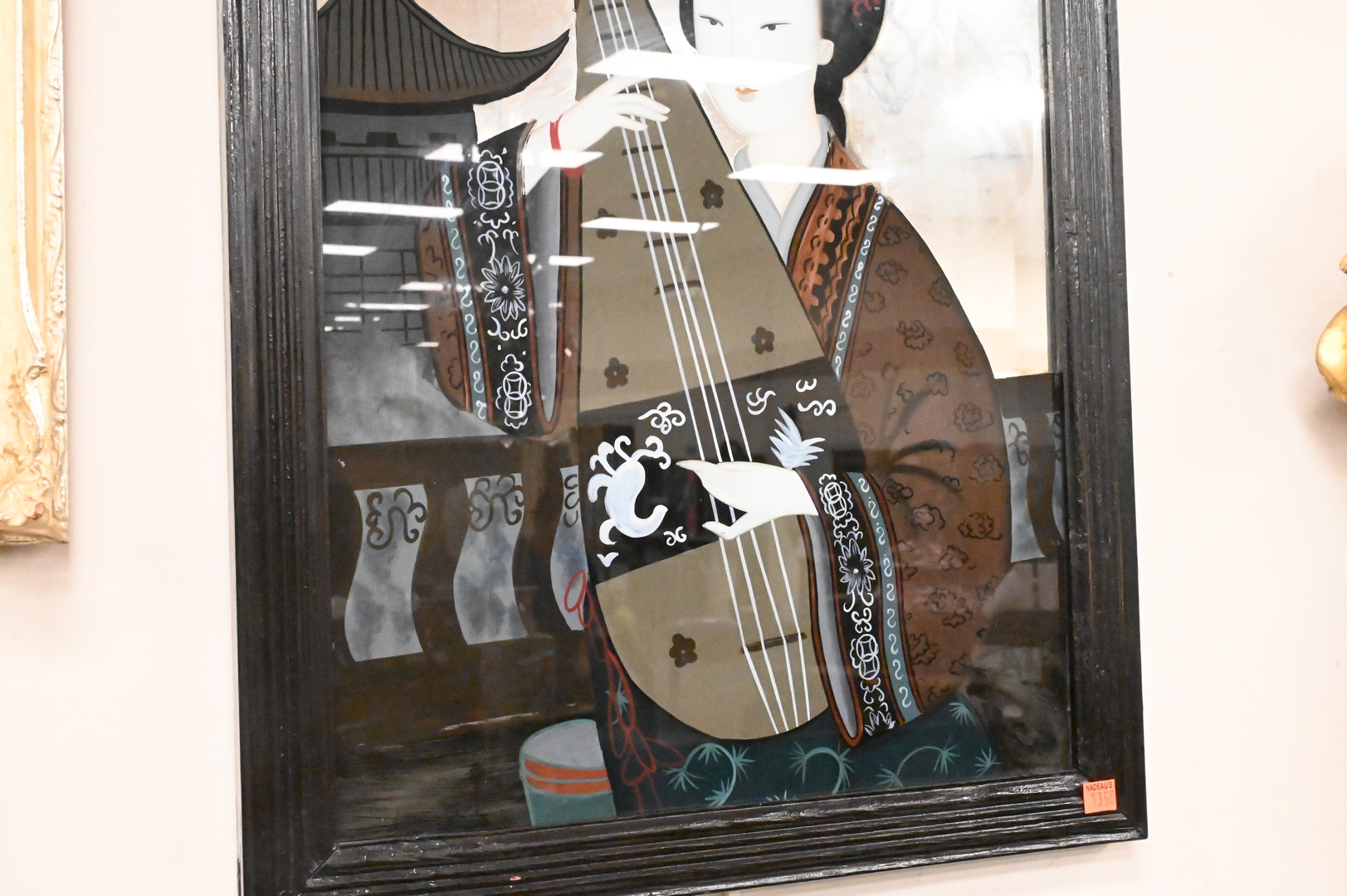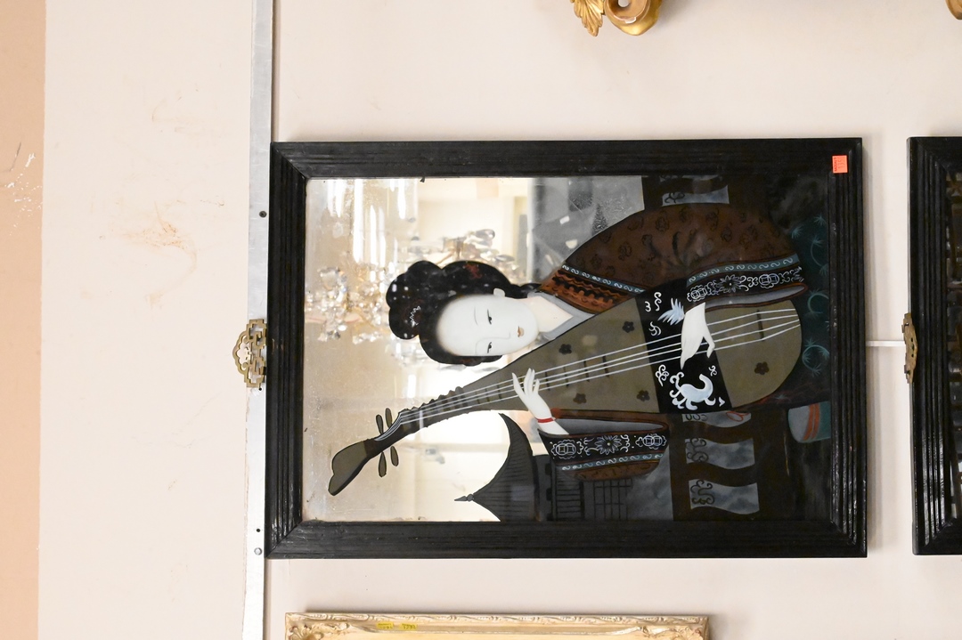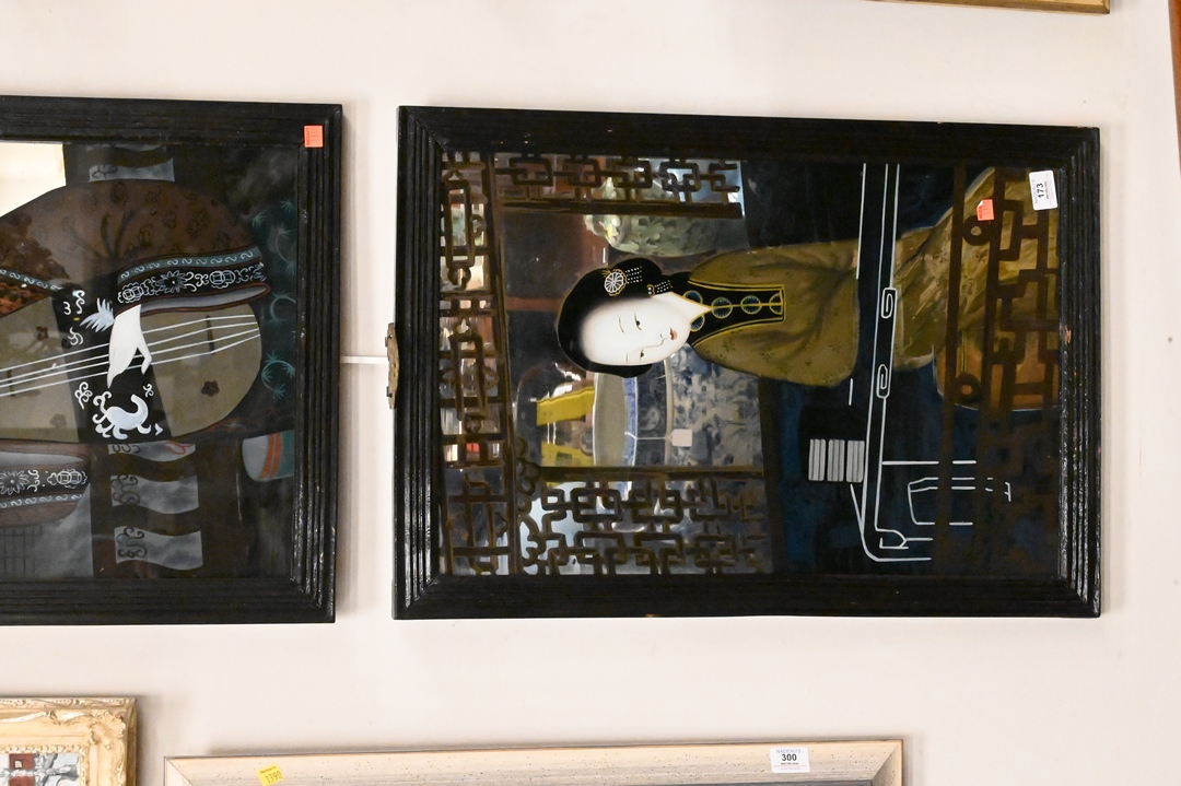 Two Chinese Reverse-Painted Mirror Portraits, one depicting a woman with a stringed musical instrument; along with a woman seated at table before pierced trellis, carved wood painted frame with pierced hanging bracket, each 28″ x 19 1/2″.