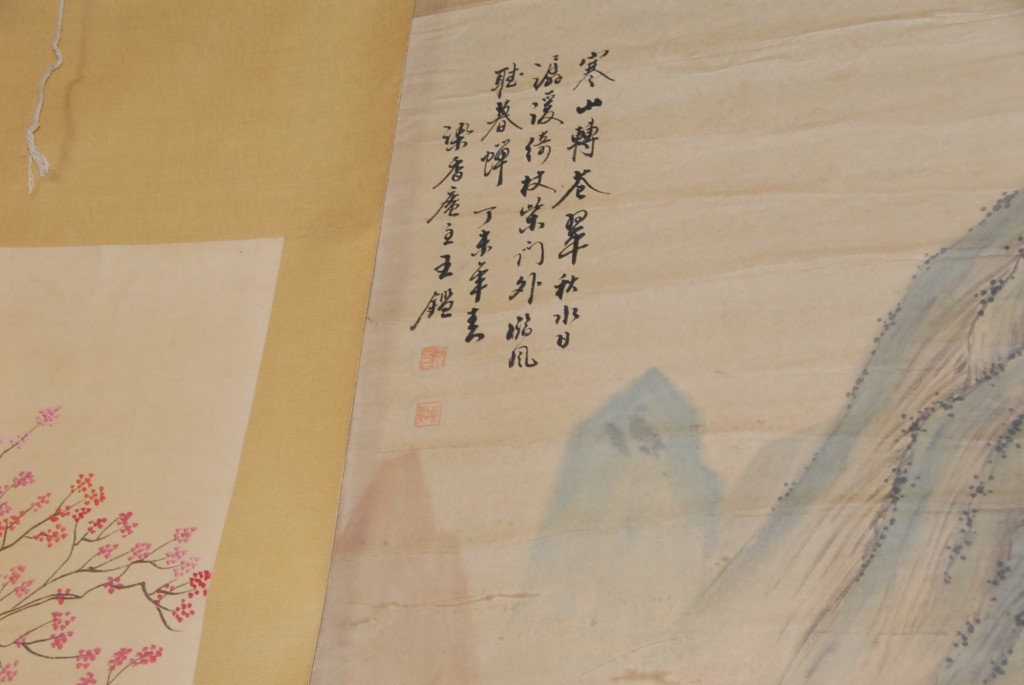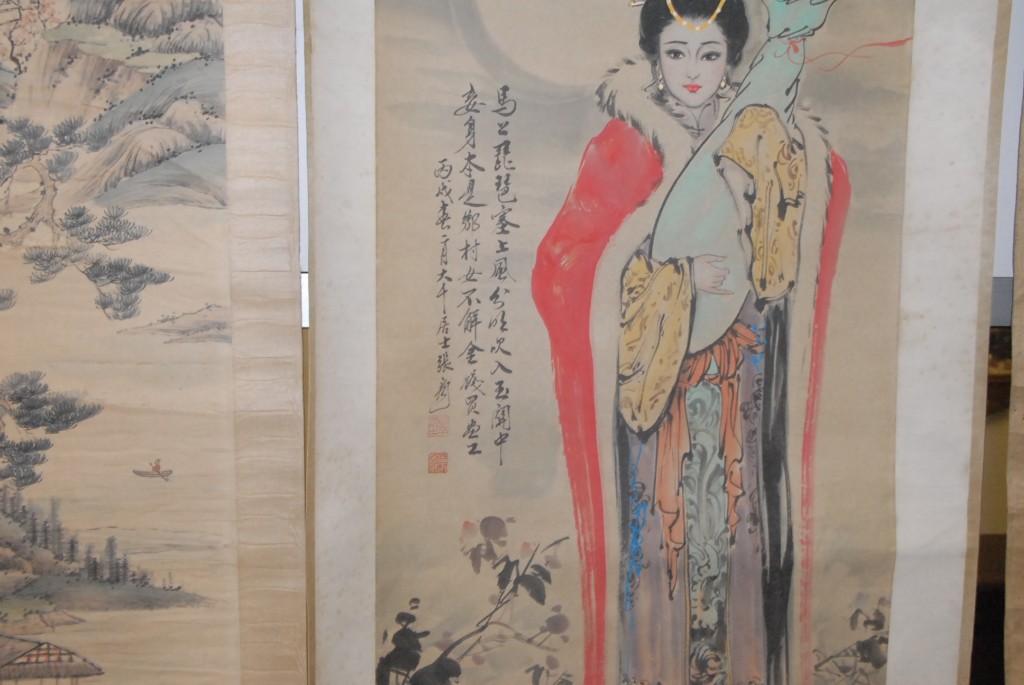 Two Oriental scrolls watercolors on paper guanyin figure 37 x 18 and mountainous landscape with lake 68 x 18.