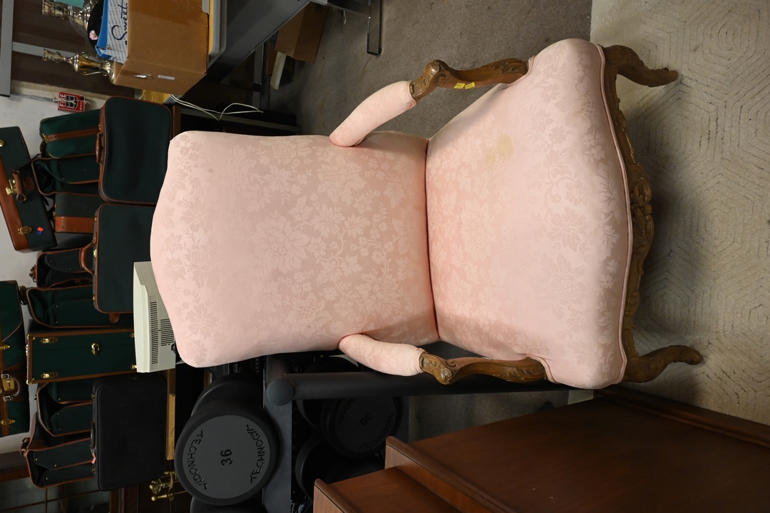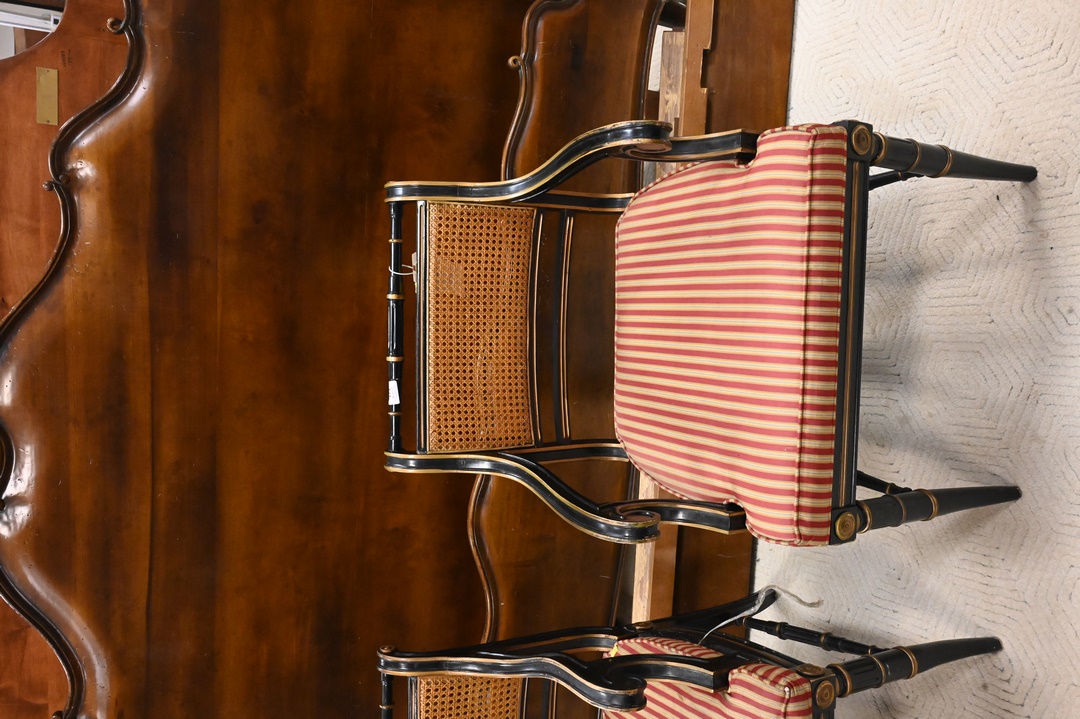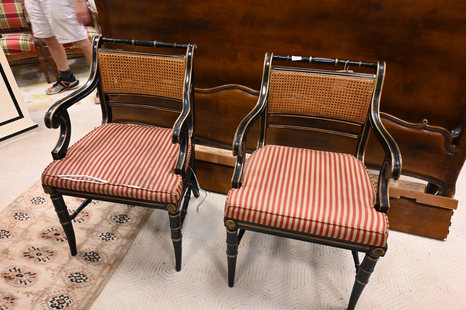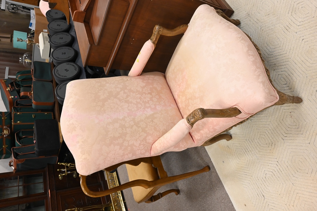 Two Pairs of Fauteuils, one having caned backs, upholstered seats, height 34 1/2 inches; along with a pair of Louis XV style.
