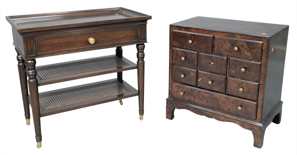 Two Piece Lot, to include a nightstand having two drawers over six drawers over one long drawer (missing one handle); along with a side table having one drawer over two medial caned shelves, height 30 inches, top 18″ x 32″, Provenance: David and Cynthia Kim, 22 Stoney Wylde Lane, Greenwich, Connecticut. View home by visiting: https://www.zillow.com/homedetails/22-Stoney-Wylde-Ln-Greenwich-CT-06830/177238281_zpid/.