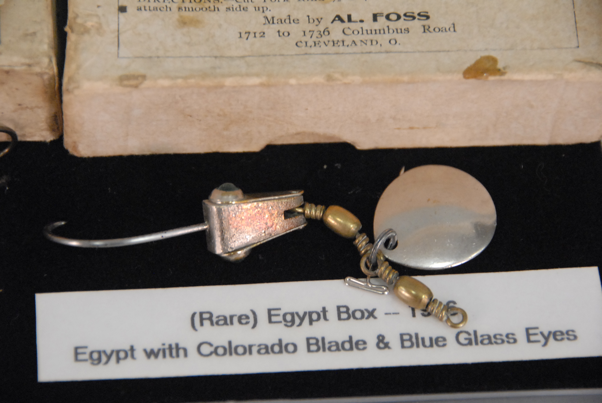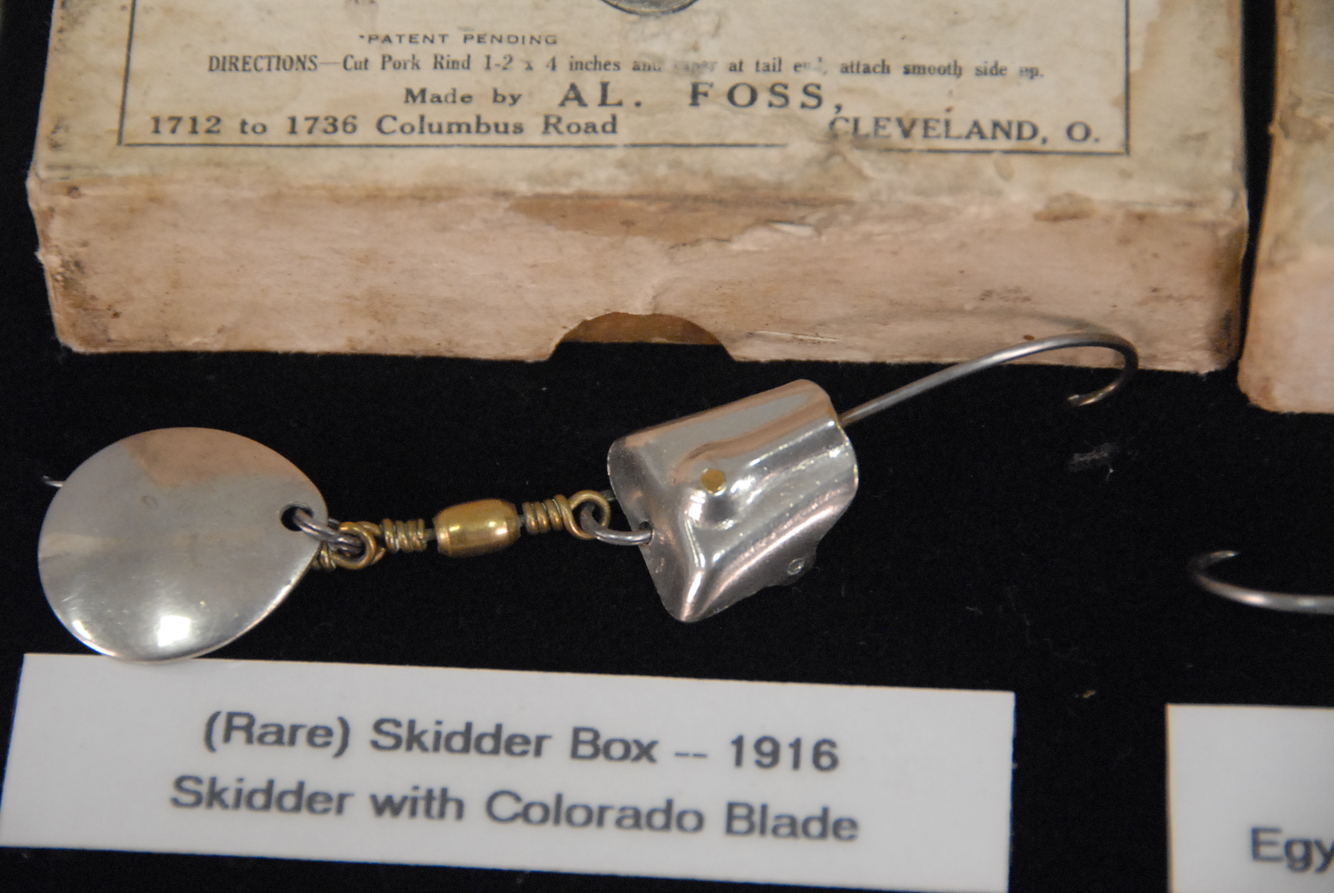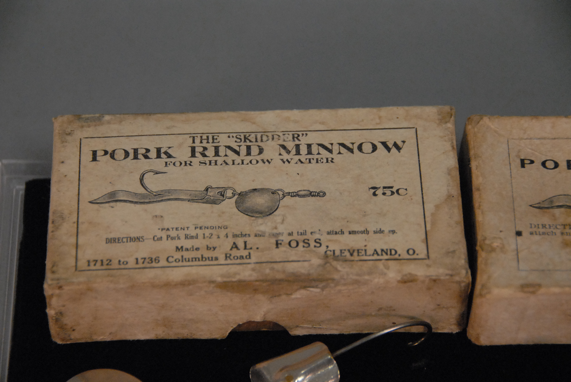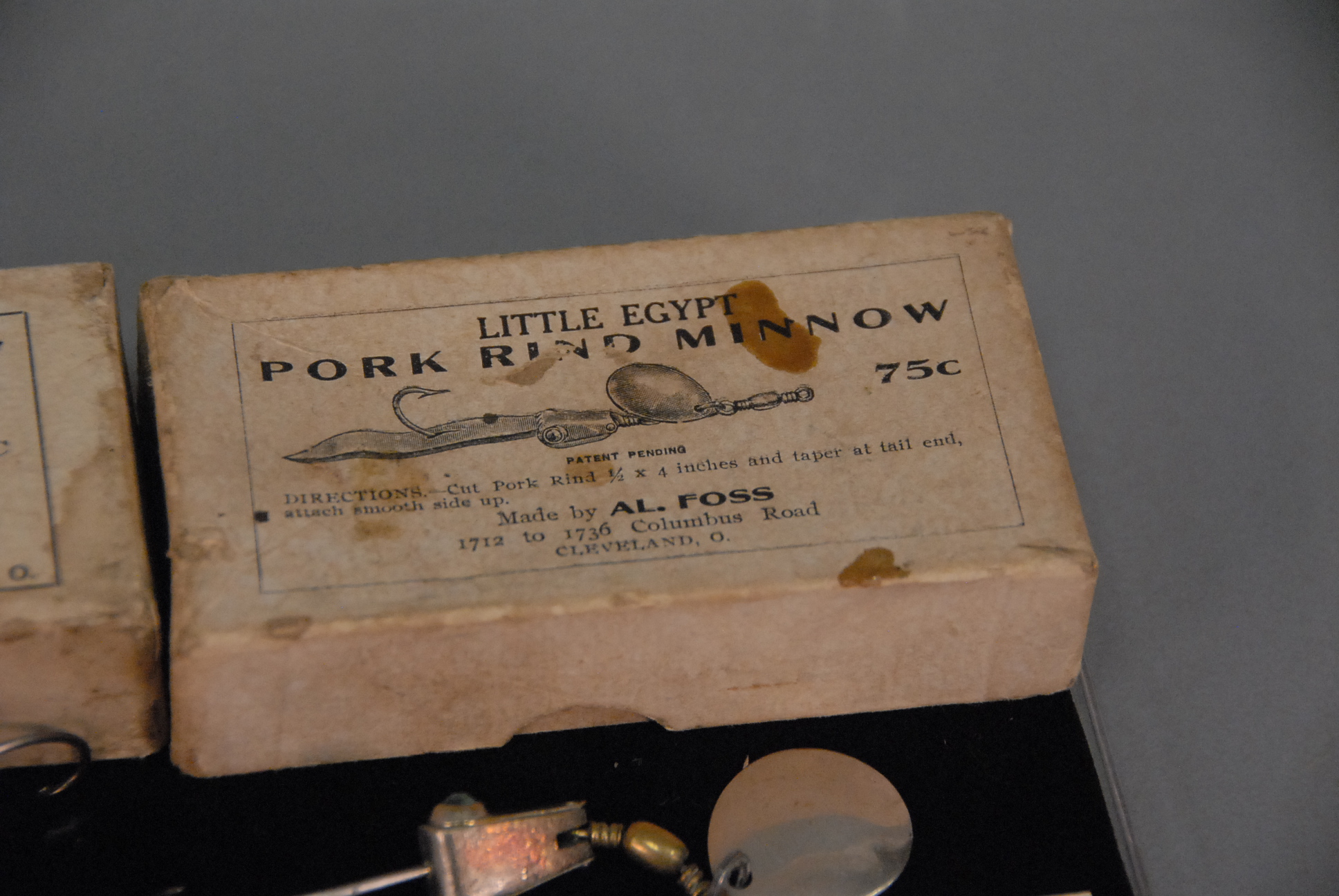 Two rare original Al Foss pork rind minnow lures with original 1916 boxes to include The Skidder and Little Egypt.
