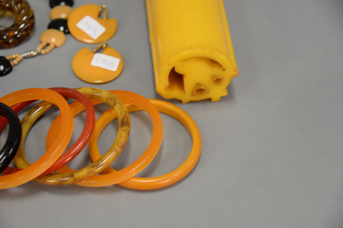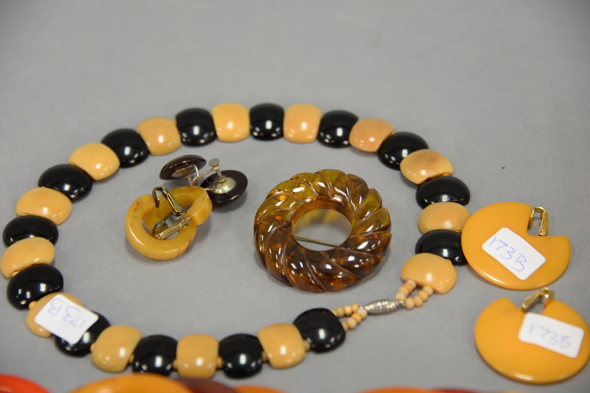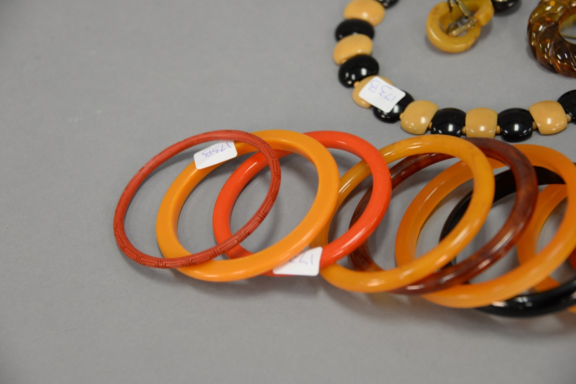 Lot 173B: Bakelite group including twelve bracelets, two pins, and three sets of earrings.