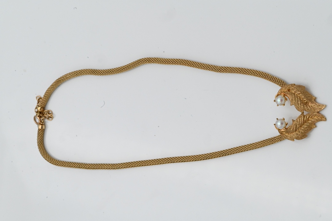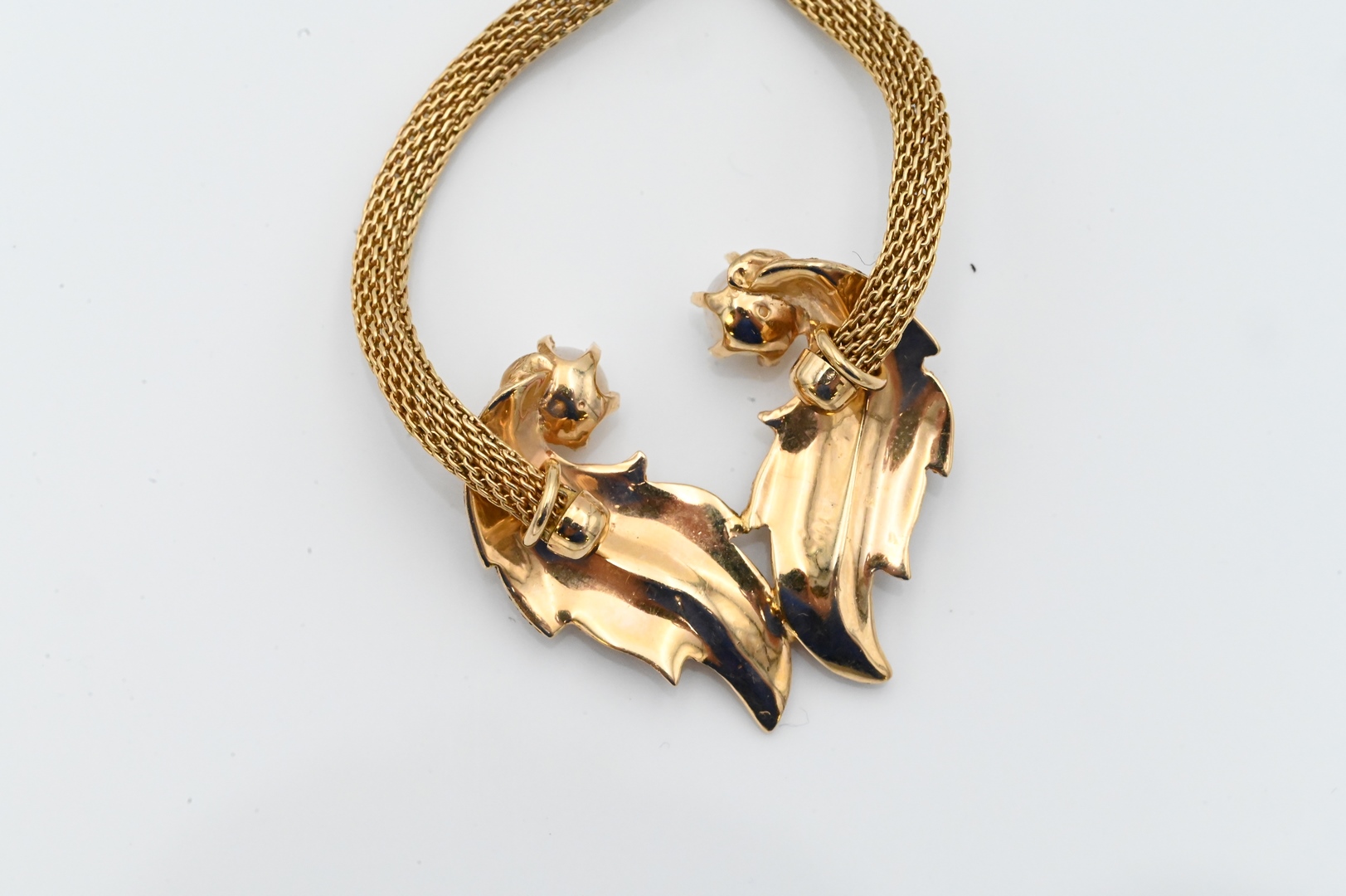 having double leaf pendant set with one pearl on each leaf