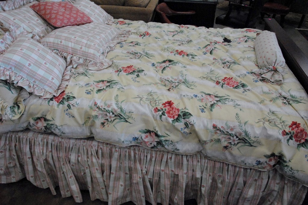 Lot 174: Comforter, skirt, and several pillows for queen size bed, a lamp, and pair of matching boudoir lamps.