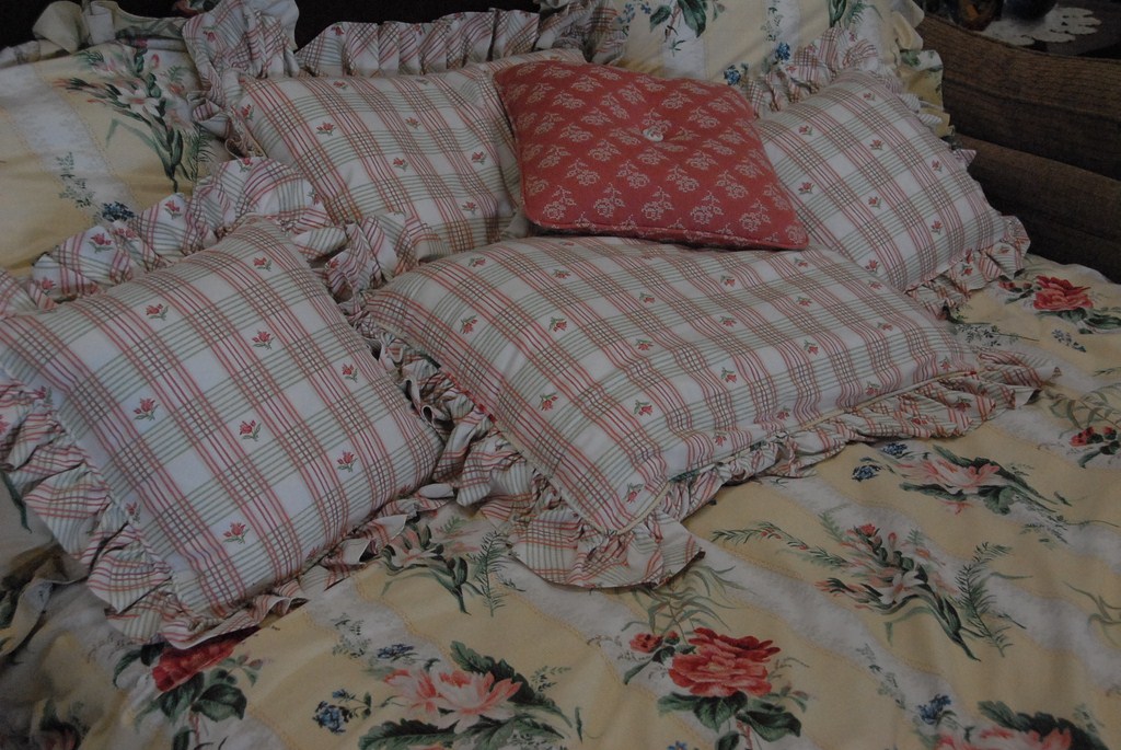 Comforter, skirt, and several pillows for queen size bed, a lamp, and pair of matching boudoir lamps.