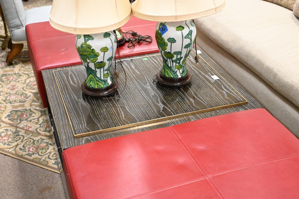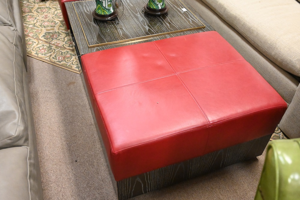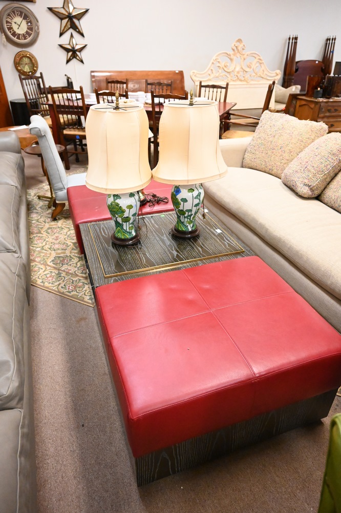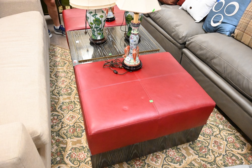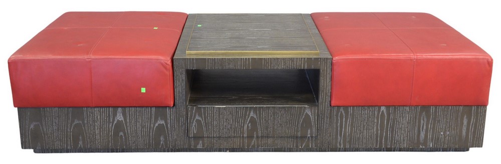 Lot 174: Custom Coffee Table/Bench with red leather upholstery and two drawers, height 18 inches, top 33″ x 79 1/2″, (two chips on drawer lips). Provenance: David and Cynthia Kim, 22 Stoney Wylde Lane, Greenwich, Connecticut. View home by visiting: https://www.zillow.com/homedetails/22-Stoney-Wylde-Ln-Greenwich-CT-06830/177238281_zpid/