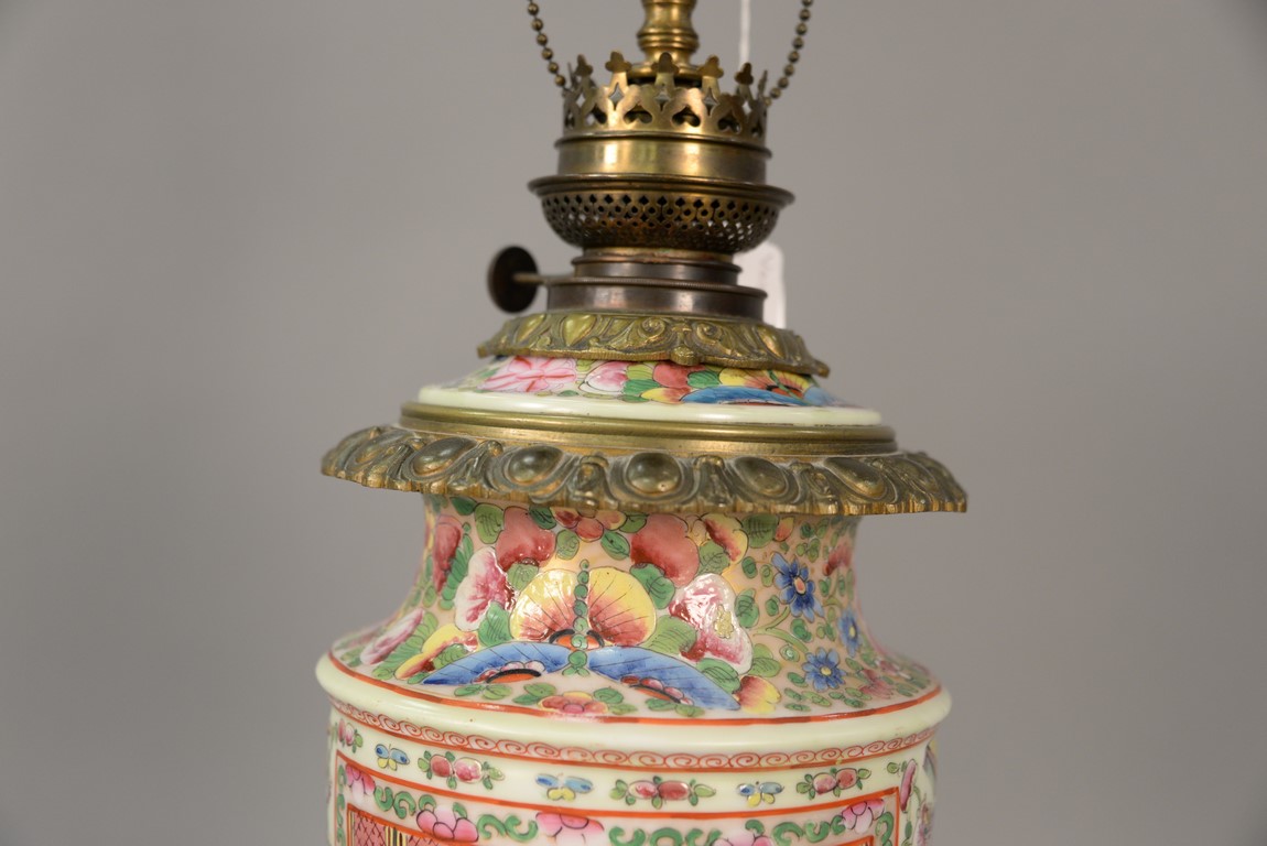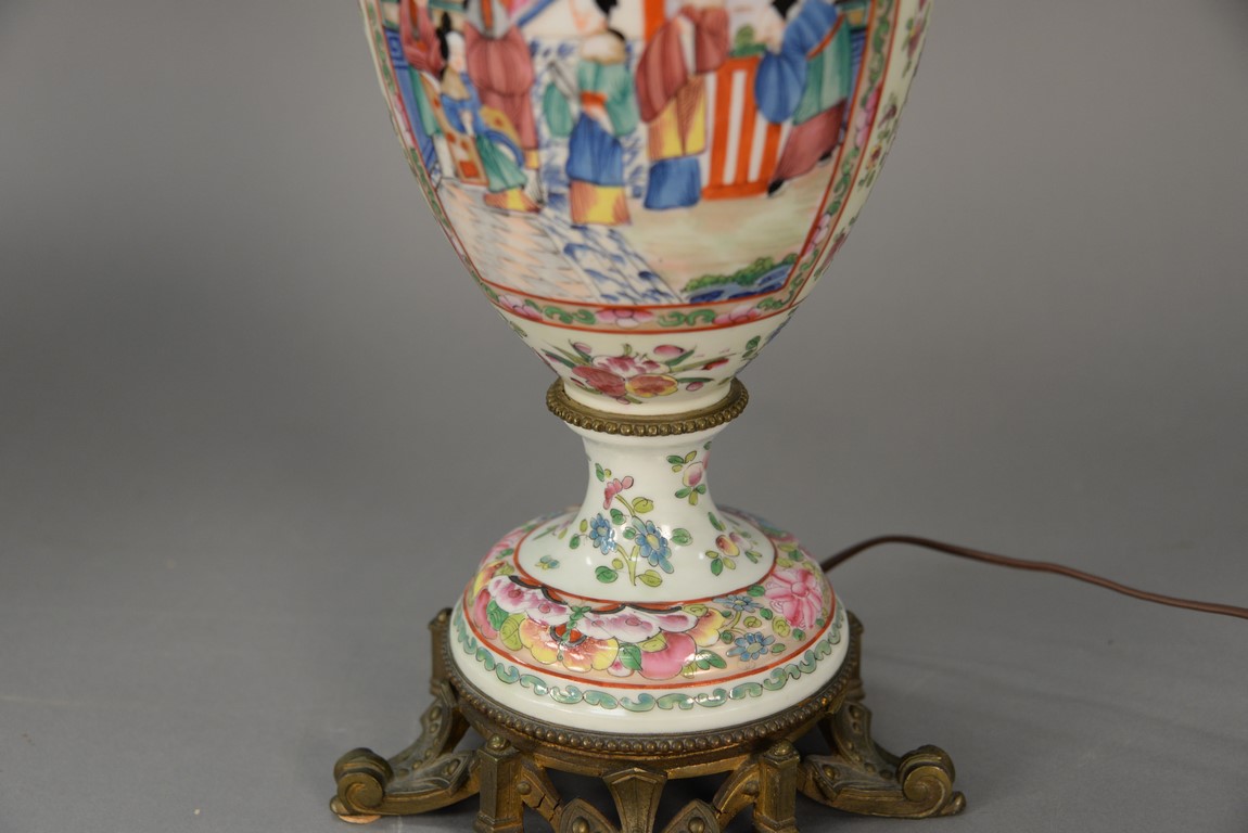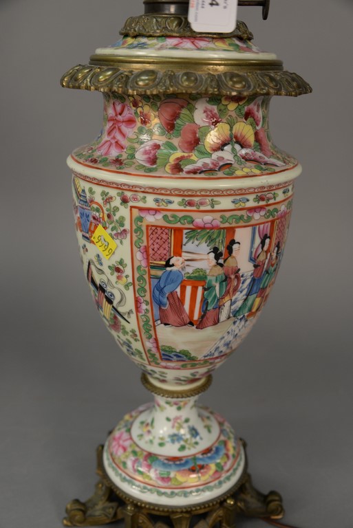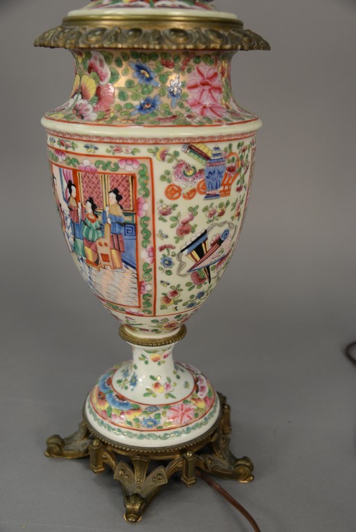 Famille Rose porcelain covered urn with cover, bronze mounted and made into a table lamp. ht. 31 in. vase ht. 15 in.