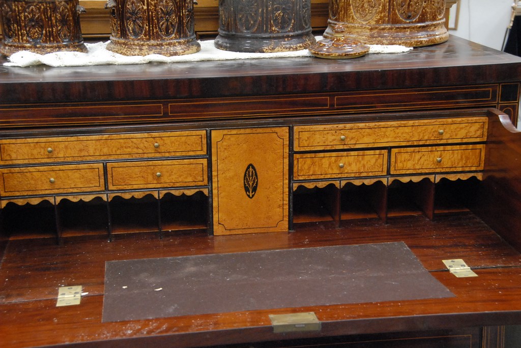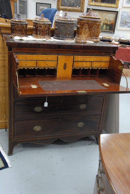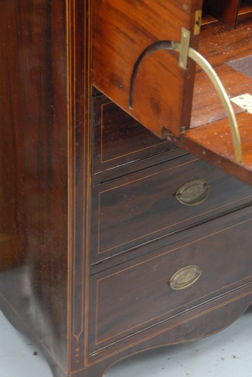 Federal mahogany butler’s secretary desk having large top drawer with pull down writing surface over three drawers, interior with birdseye maple drawers and door, and felt writing surface, all set on flaring French feet, case with overall line inlays, 1790-1800. ht. 48in. wd. 45in. dp. 25in.