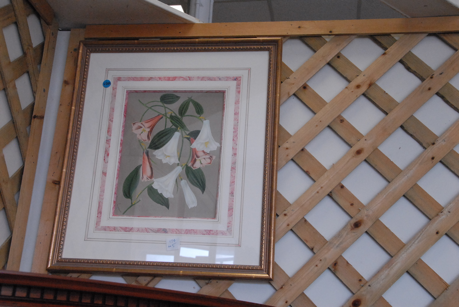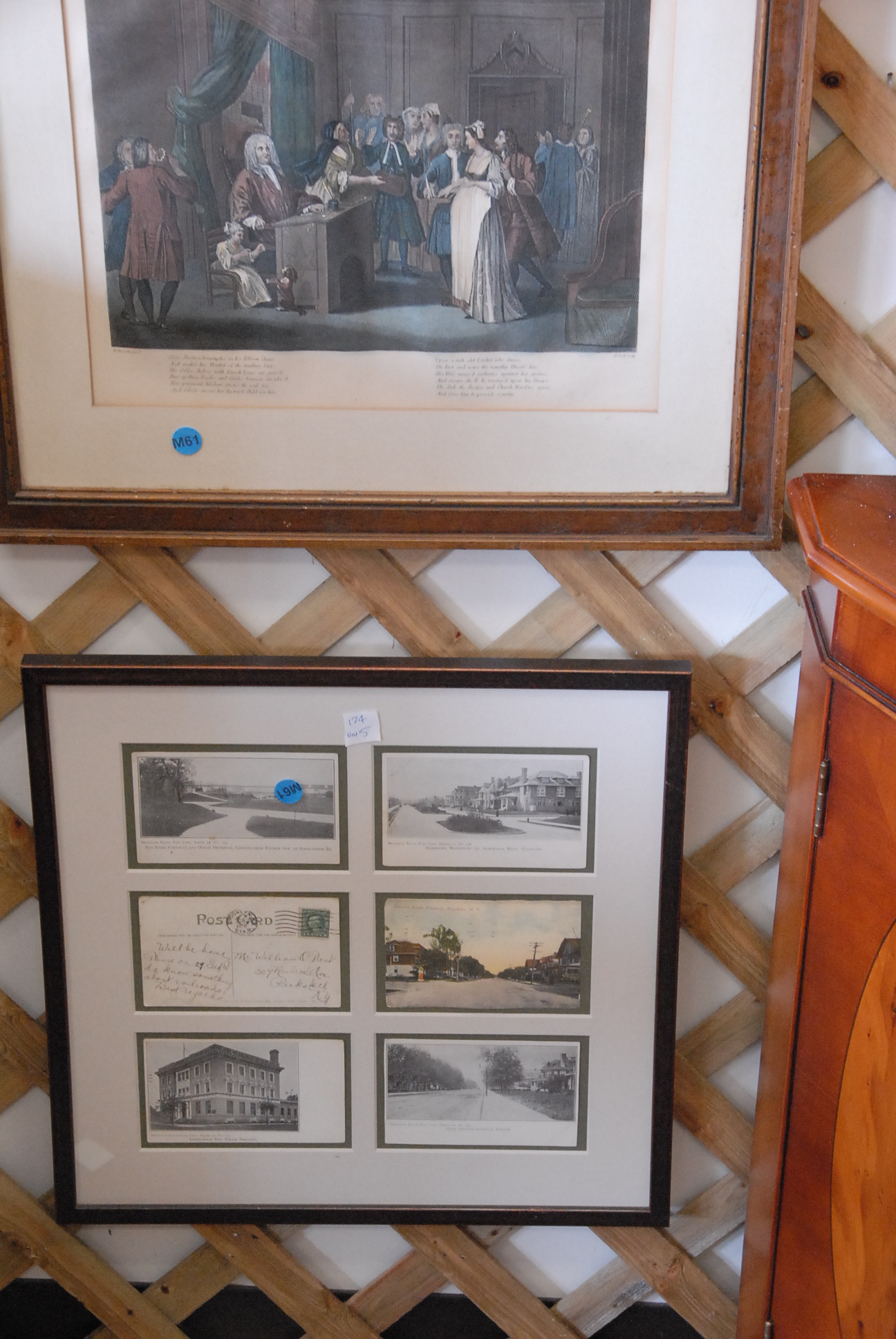 Five piece lot to include a print of flowers, three interior prints, and postcards.