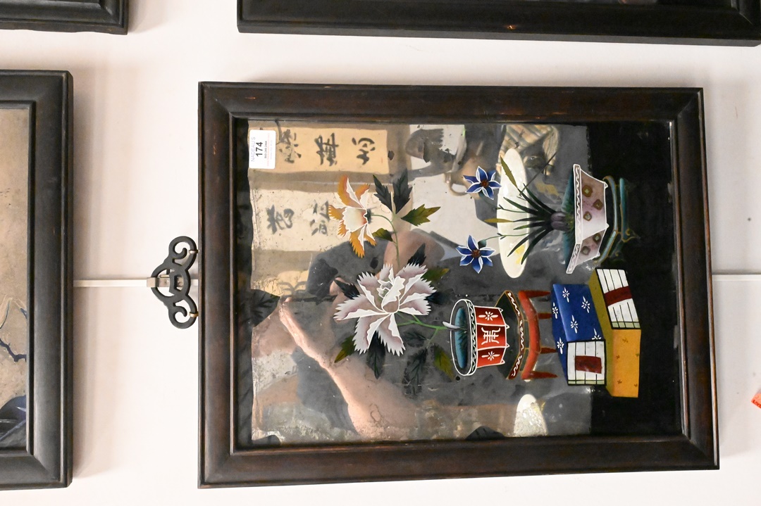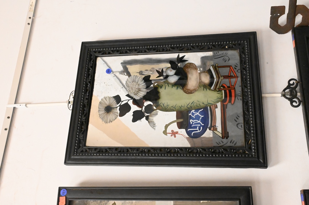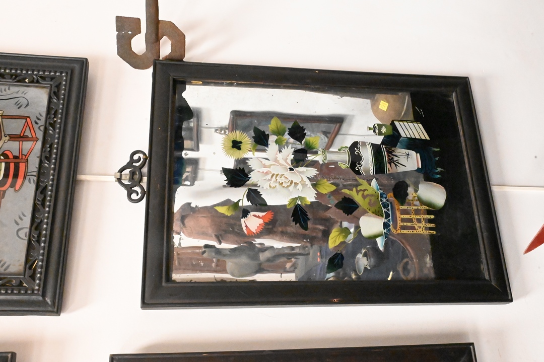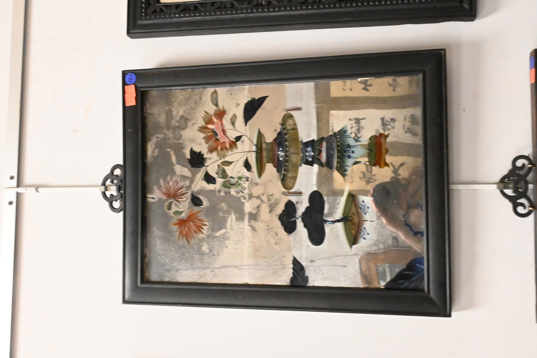 Four Chinese Reverse-Painted Mirror Paintings, depicting still lifes, each in a carved wood frame having pierced hanging brackets, two 22 1/2″ x 16 1/4″, two 16 1/4″ x 12 1/2″.