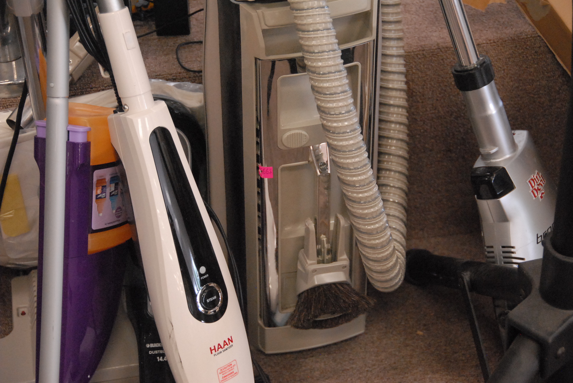 Four piece lot to include Electrolux vacuum, Black and Decker dust buster, Dirt Devil Broom Vac, and Haan Floor Sanitizer.