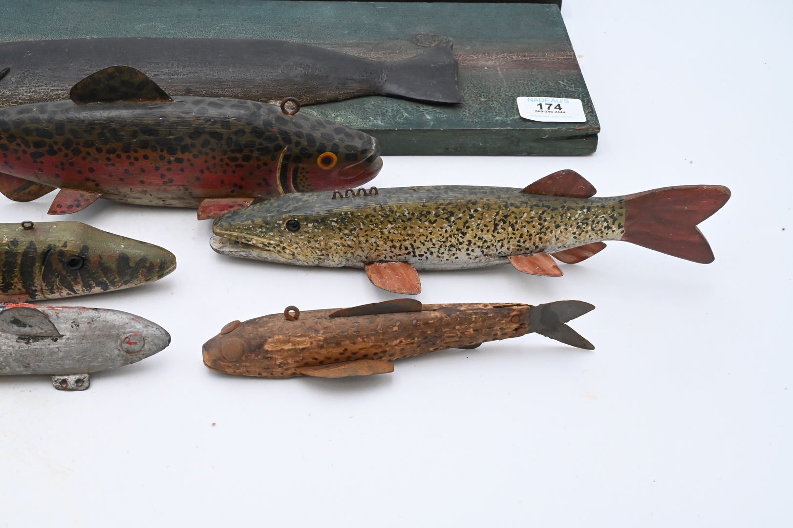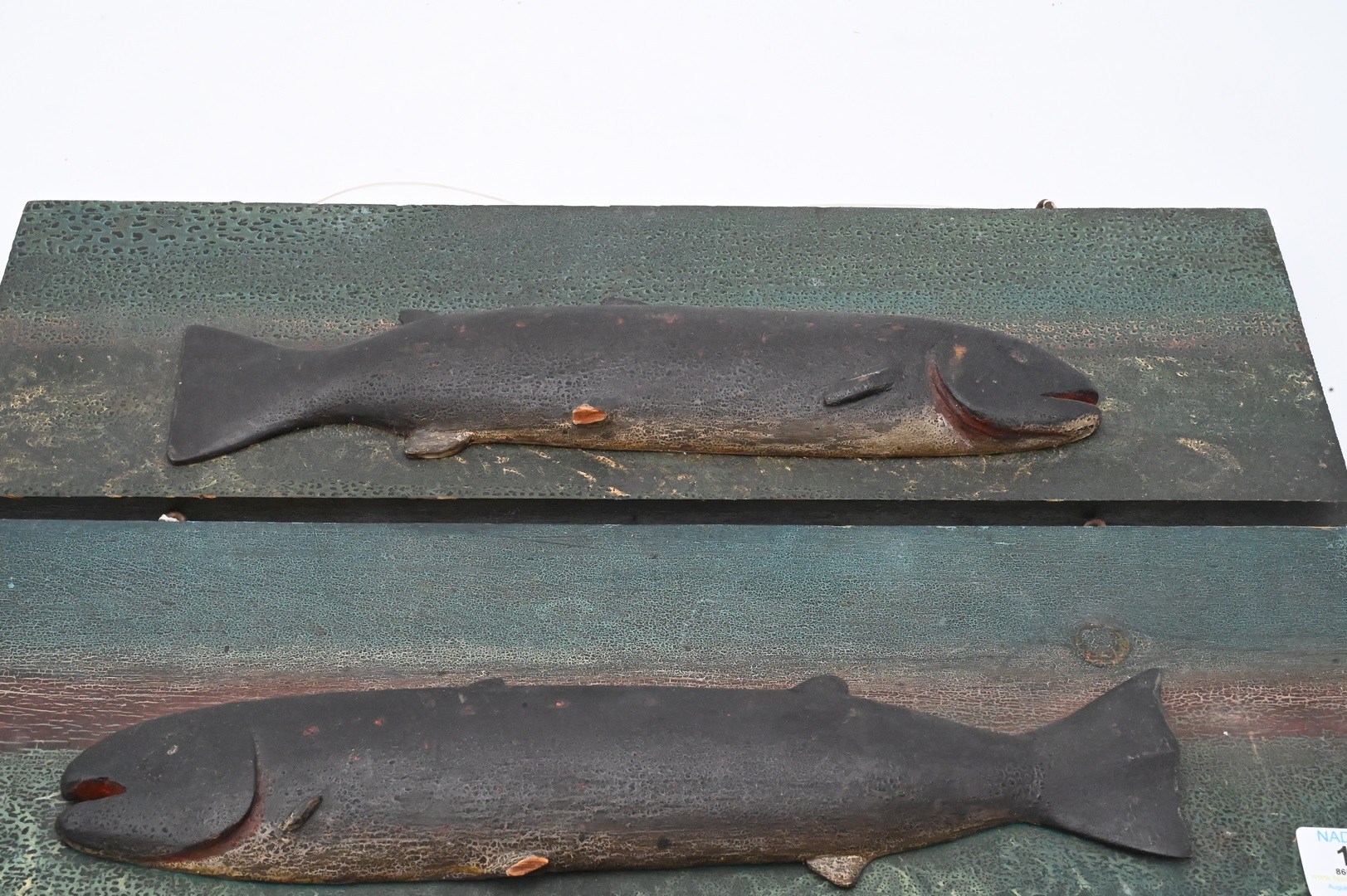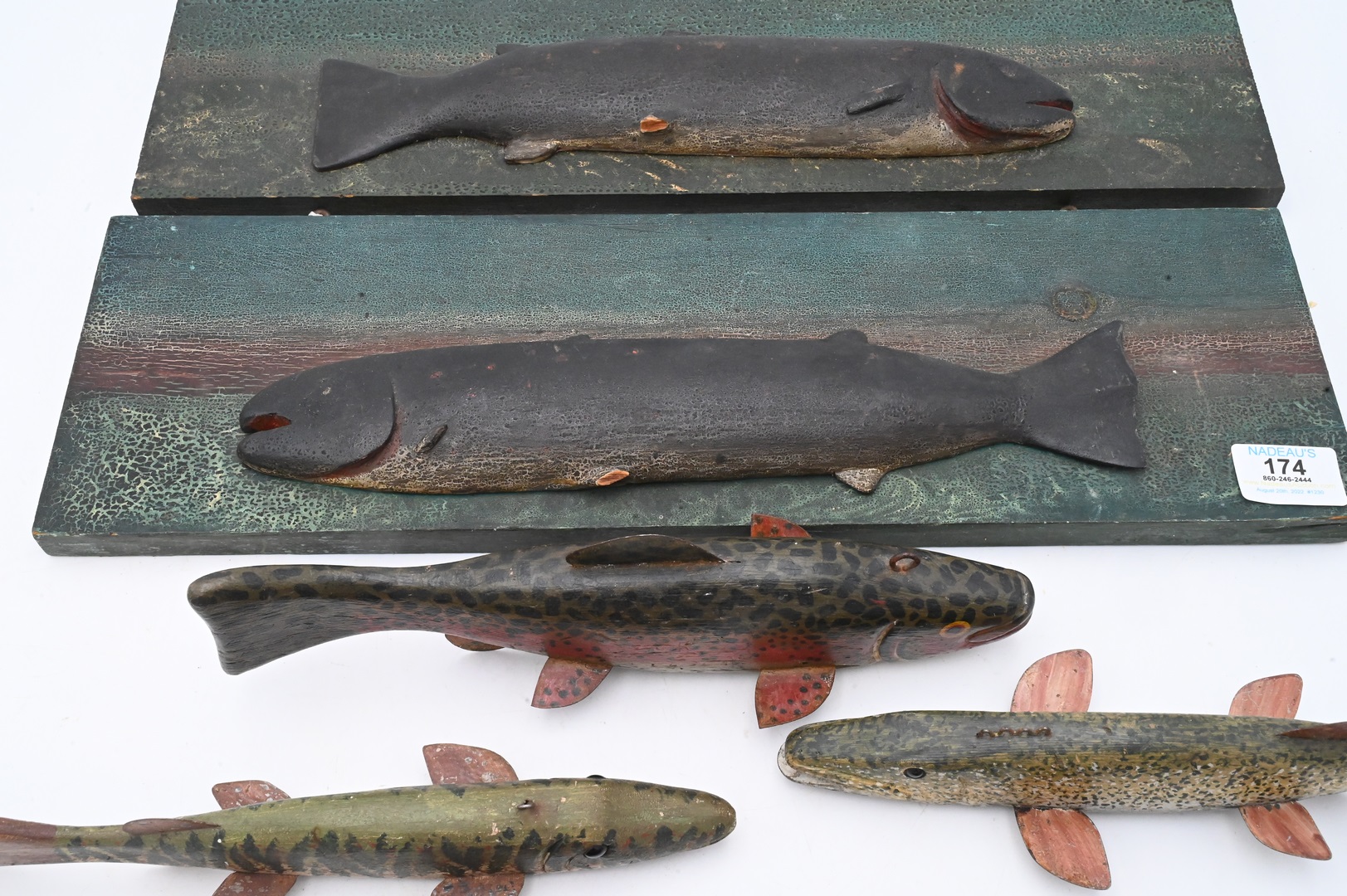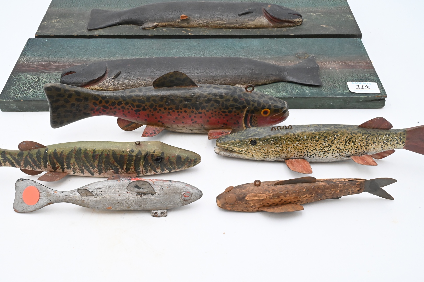 Group of Seven Carved and Painted Fish, to include five decoys, along with two primitive painted planks mounted with half fish, pike, trout, etc.; longest 19 1/4 inches. Provenance: Estate of Peter Tillou, Litchfield, Connecticut.