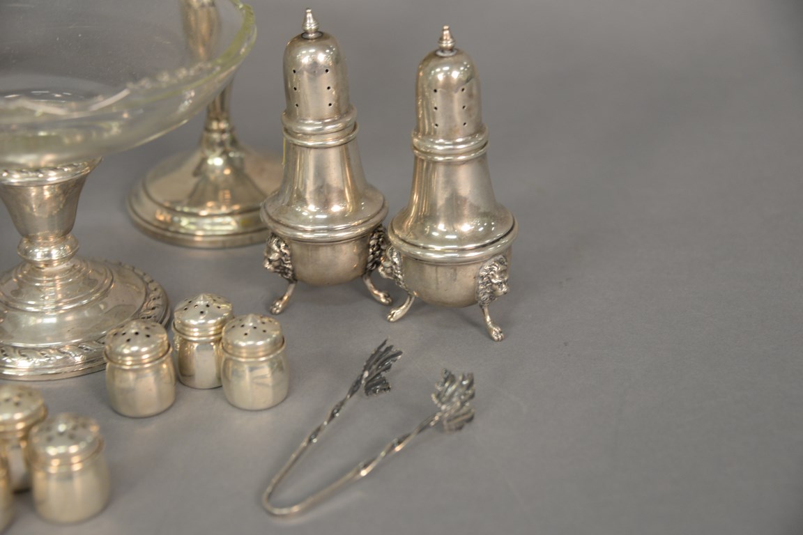 Lot 174: Group of sterling silver to include five weighted pieces, pair of large salt and pepper, and a group of 12 small salts, 6.2 t oz. we…