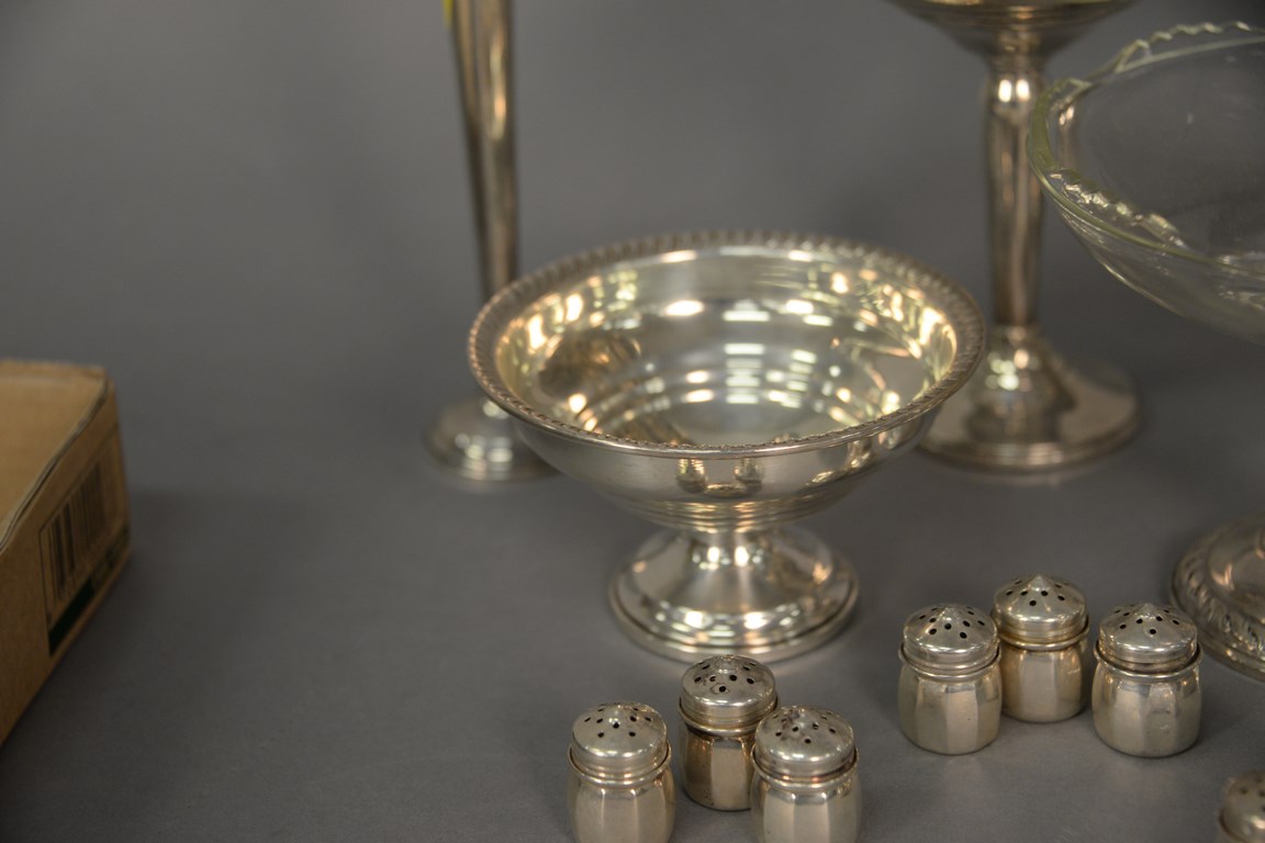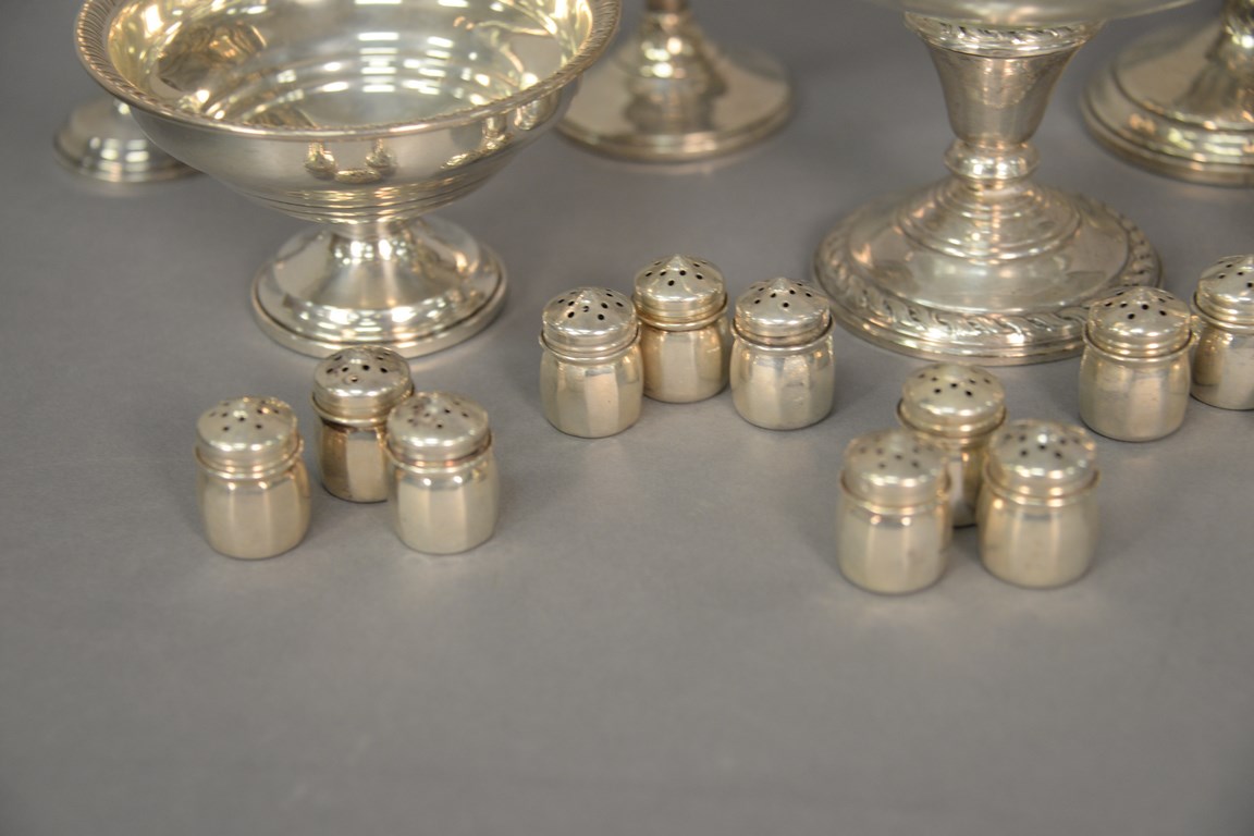 Group of sterling silver to include five weighted pieces, pair of large salt and pepper, and a group of 12 small salts, 6.2 t oz. weighable silver.