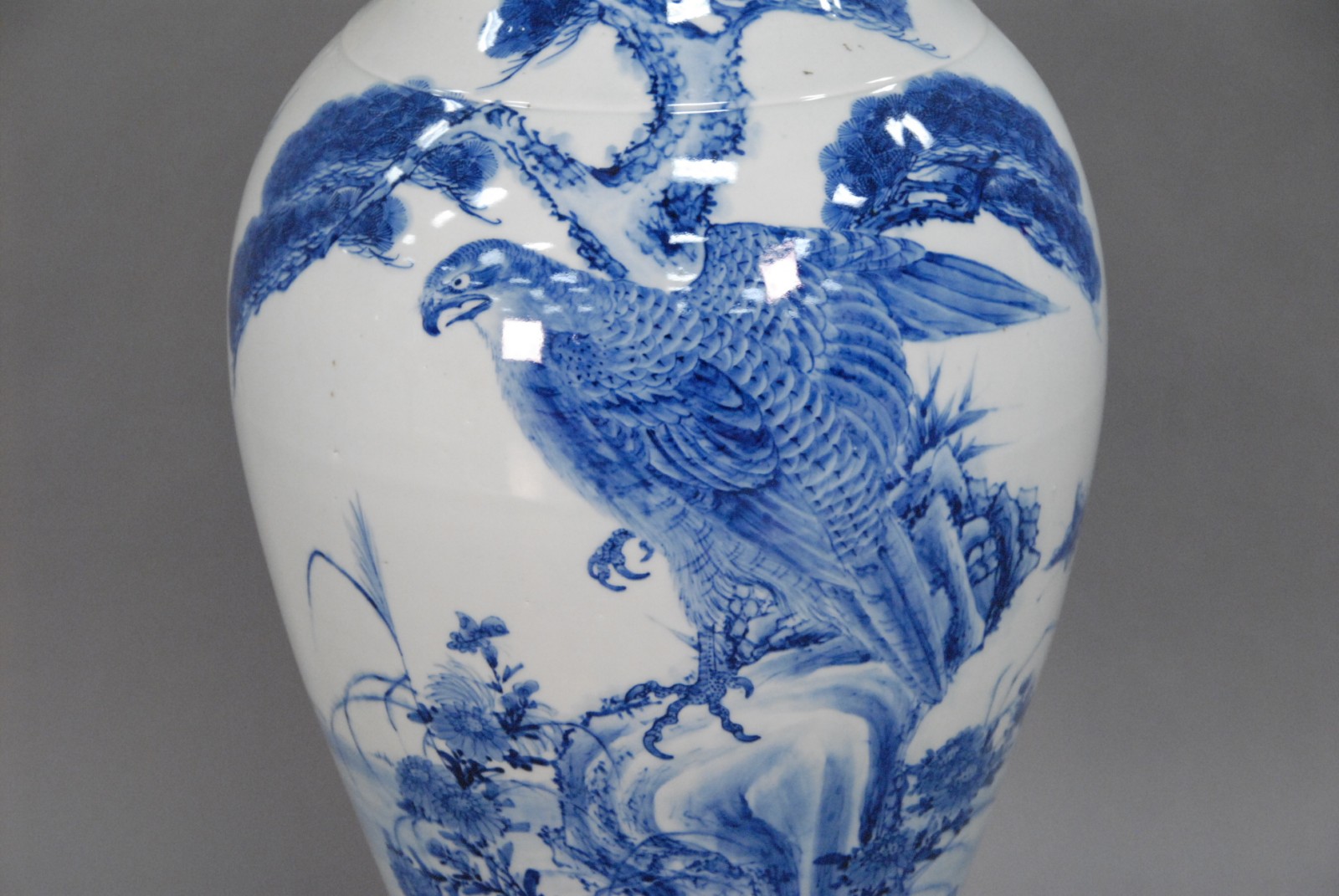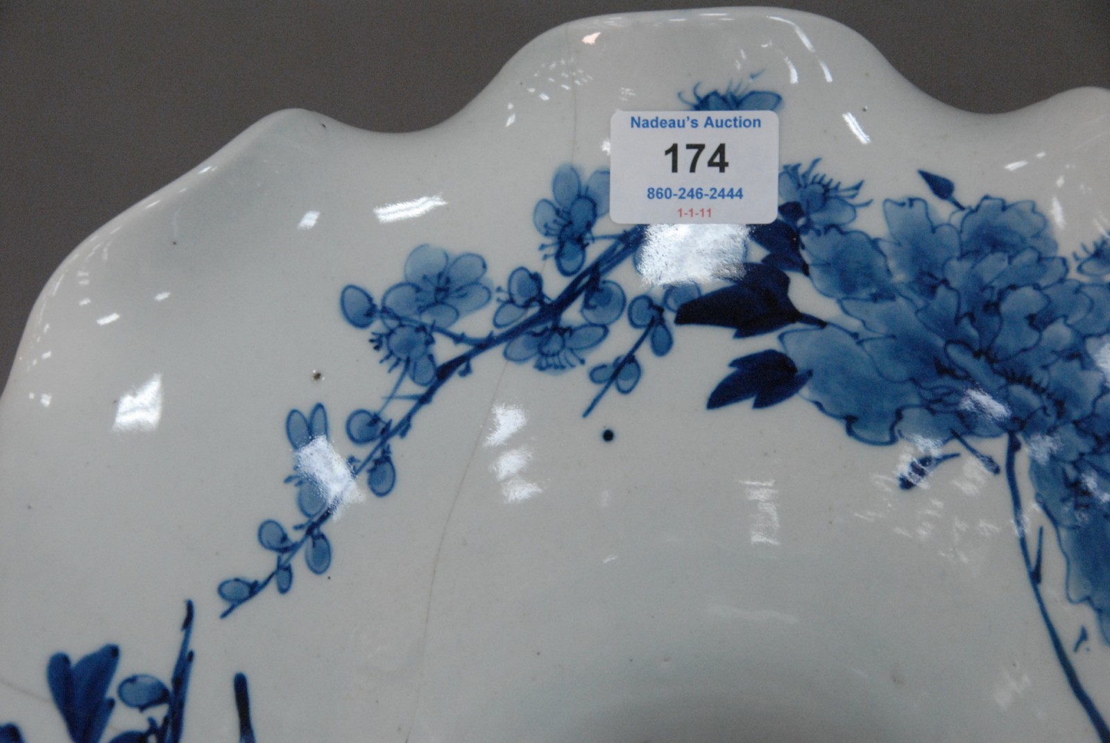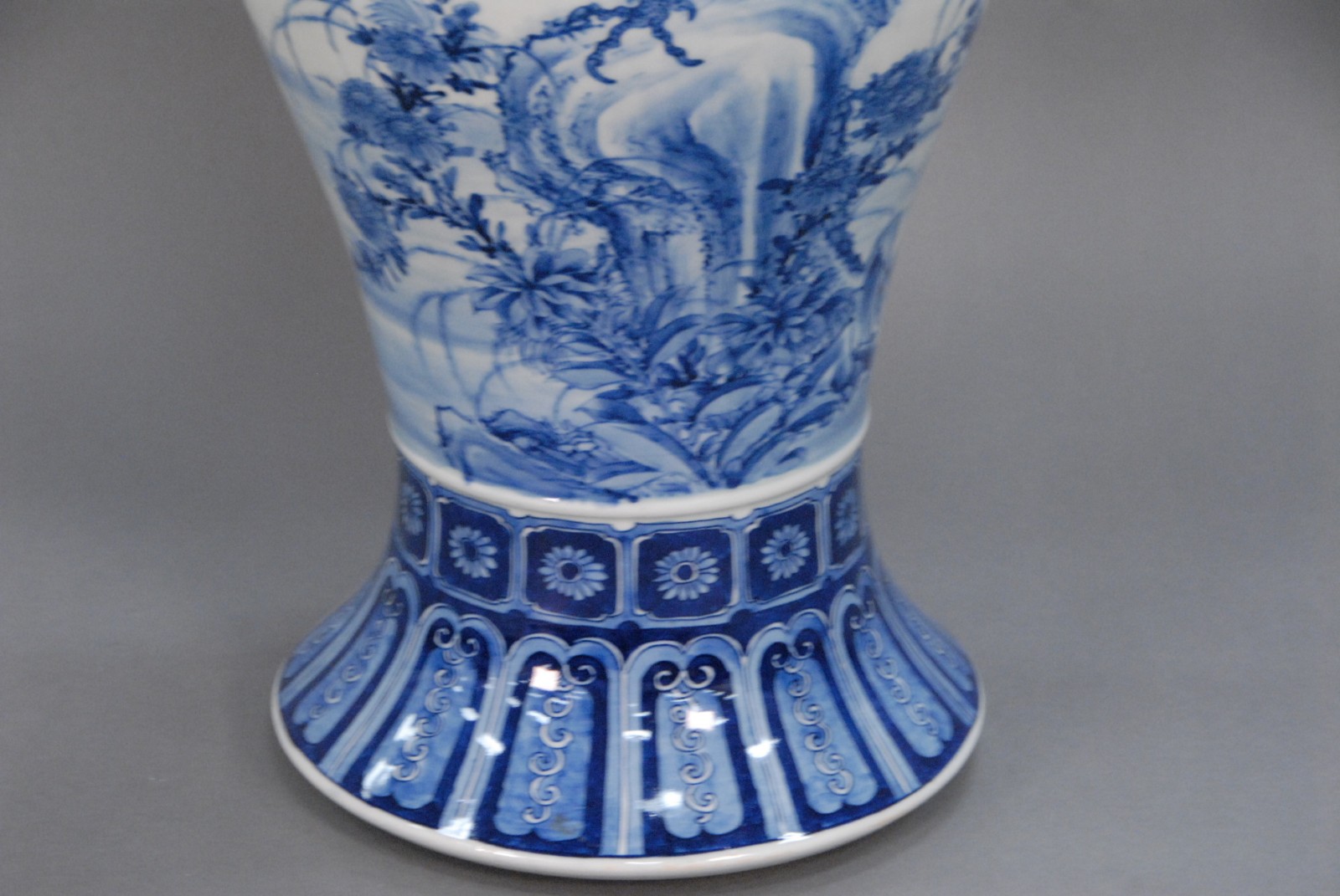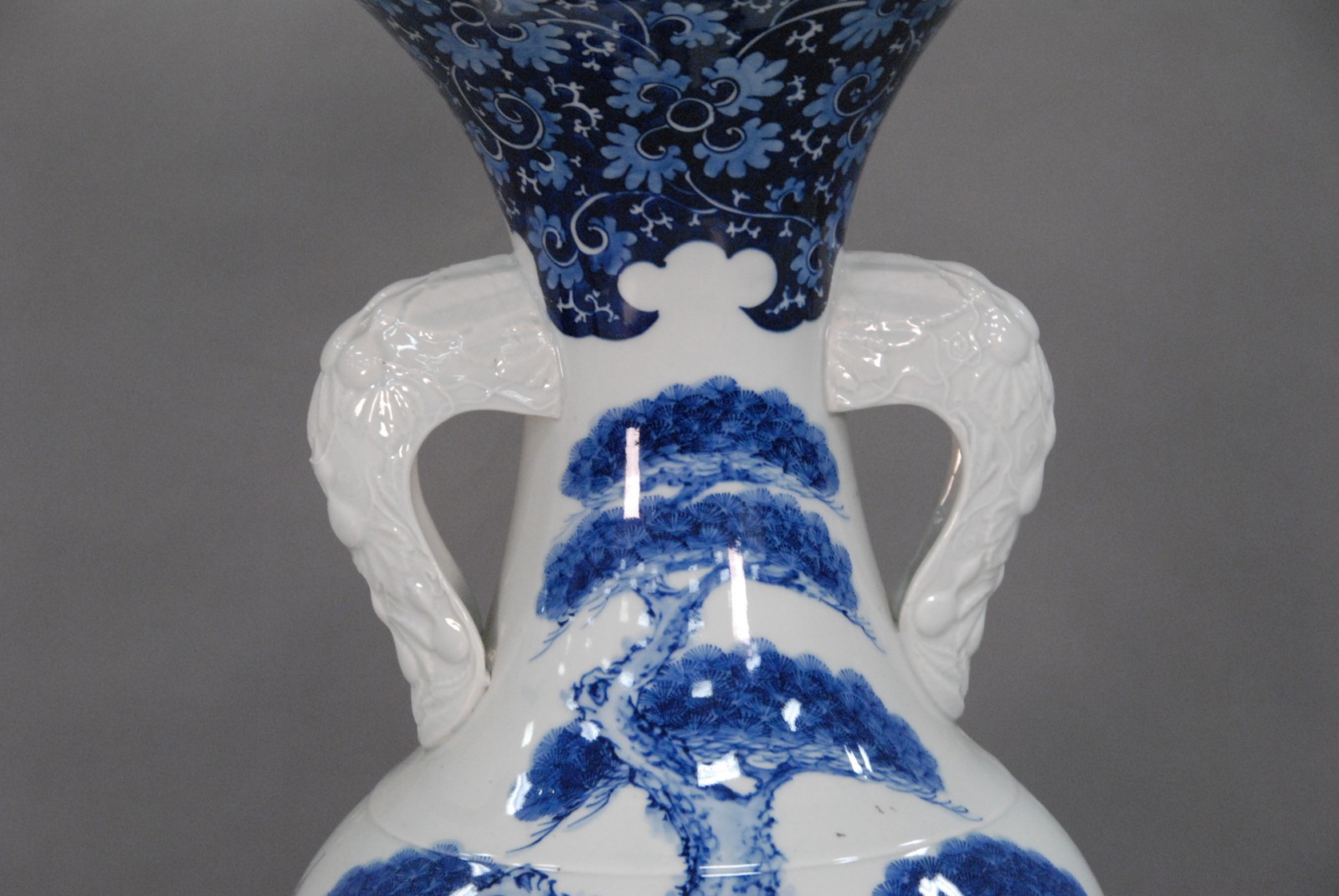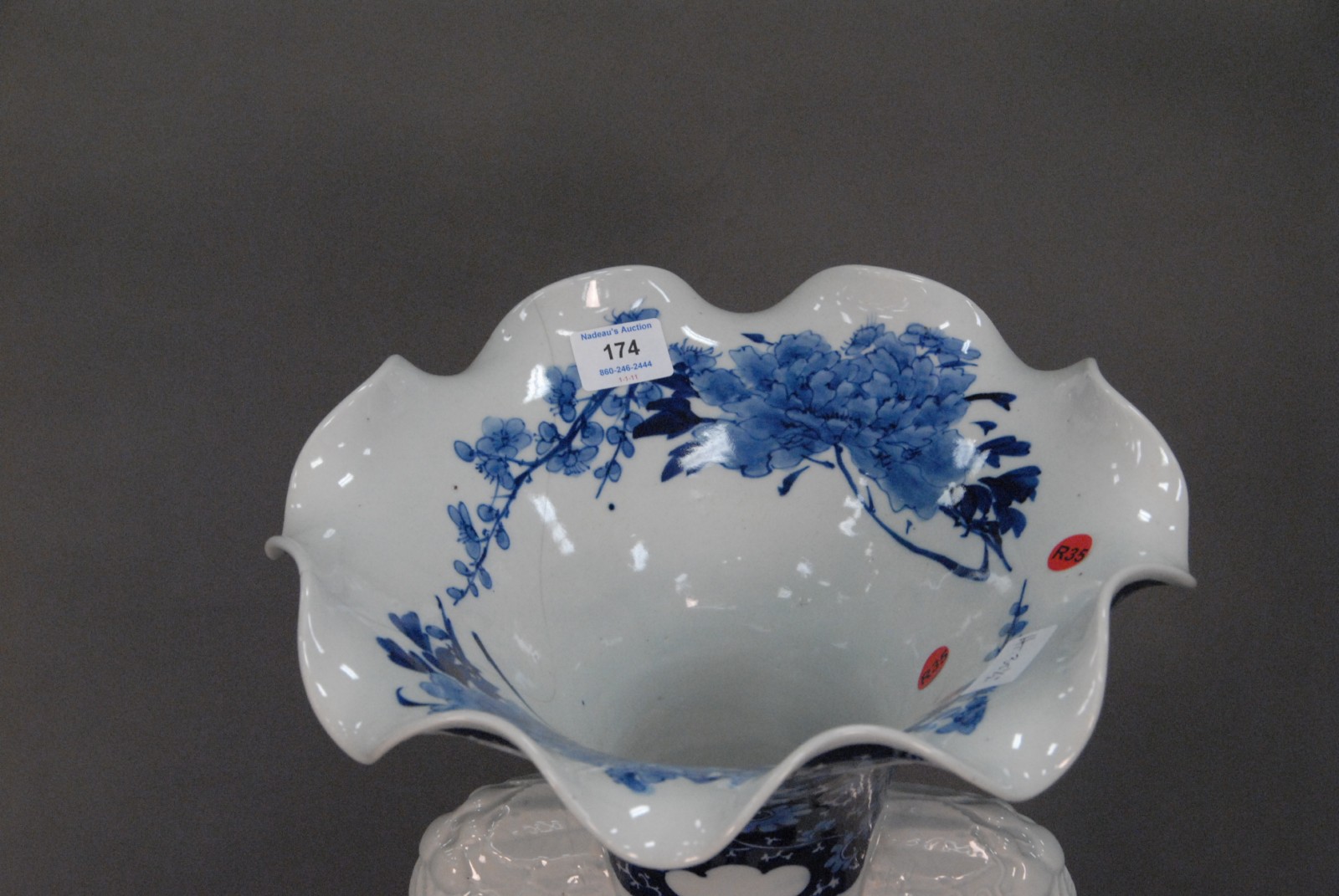Japanese blue and white porcelain vase with ruffle top top has professional repair.