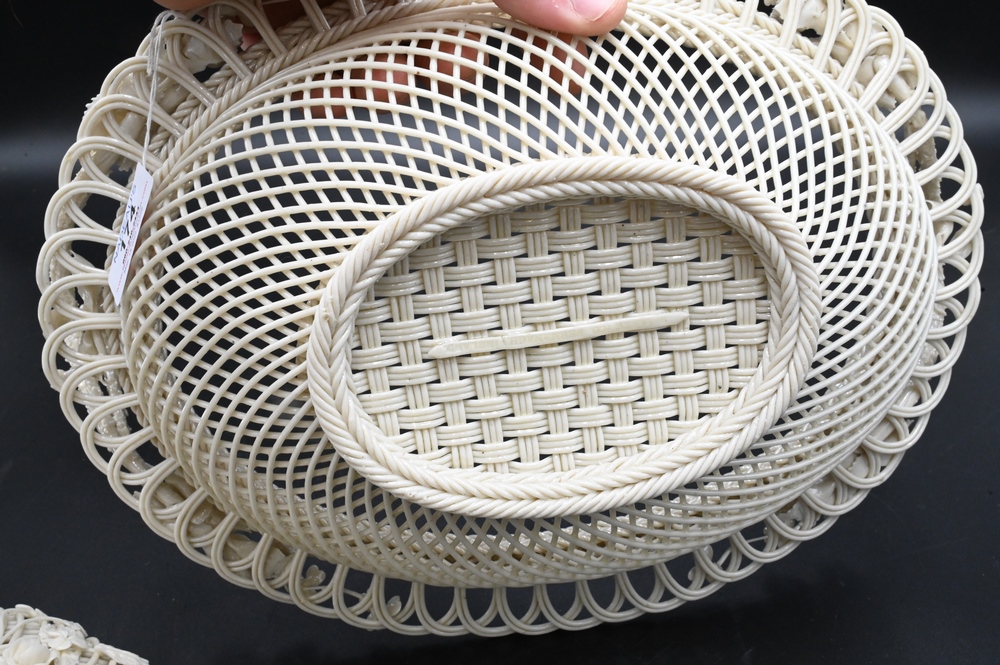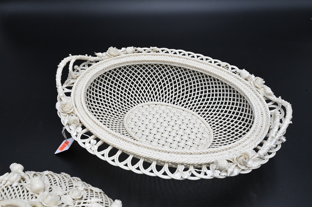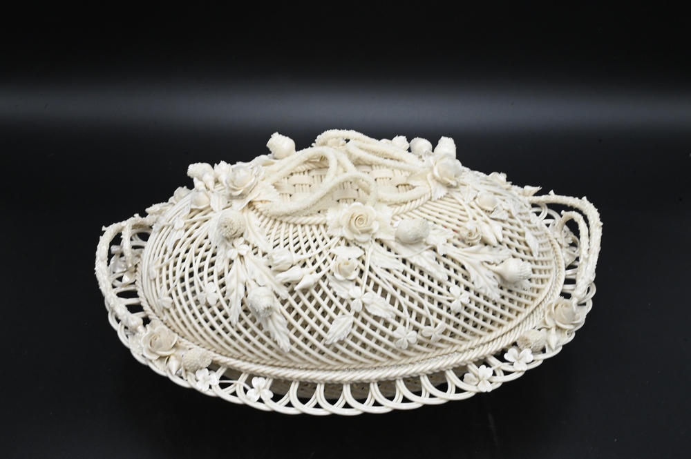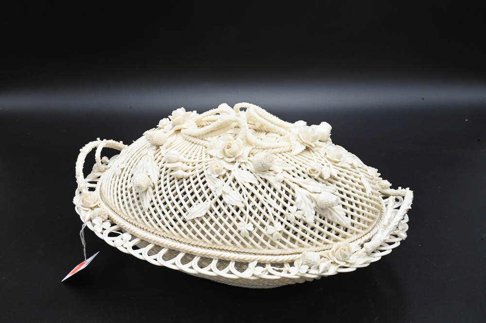 Lot 174: Large Oval Belleek Covered Basket, three strand, having reticulated cover and base with flower and leaf design, stick handles, impressed mark on bottom, height 5 1/2 inches, length 13 inches. Provenance: Collections of Norma Reilly, New Jersey.