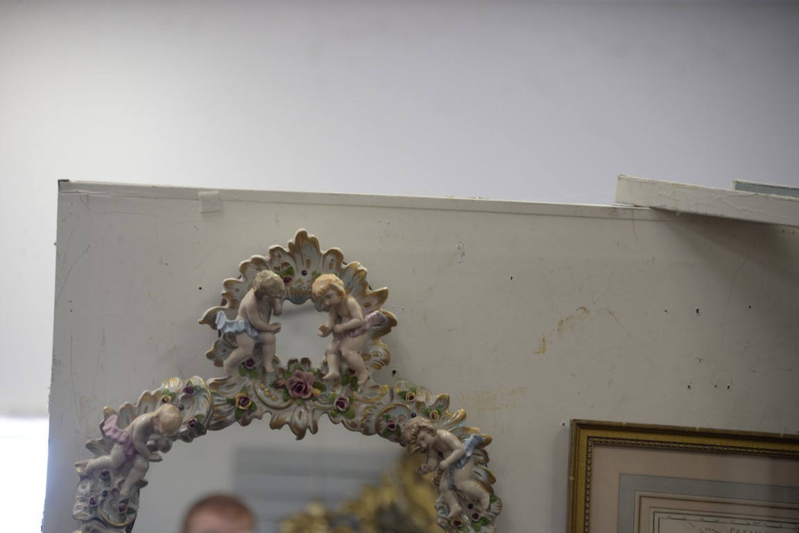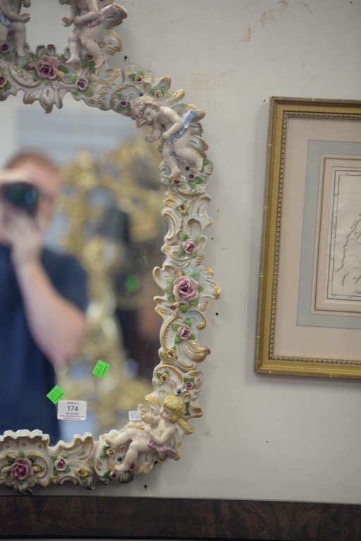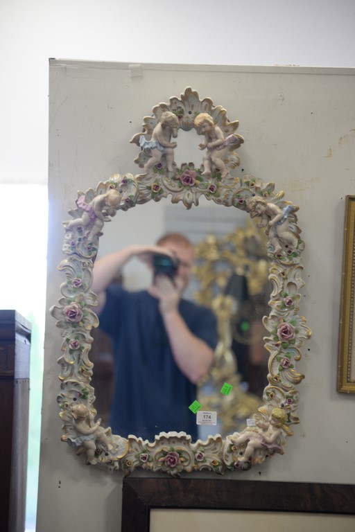 Lot 174: Mirror with German porcelain framed figures and flowers. 29 x 20