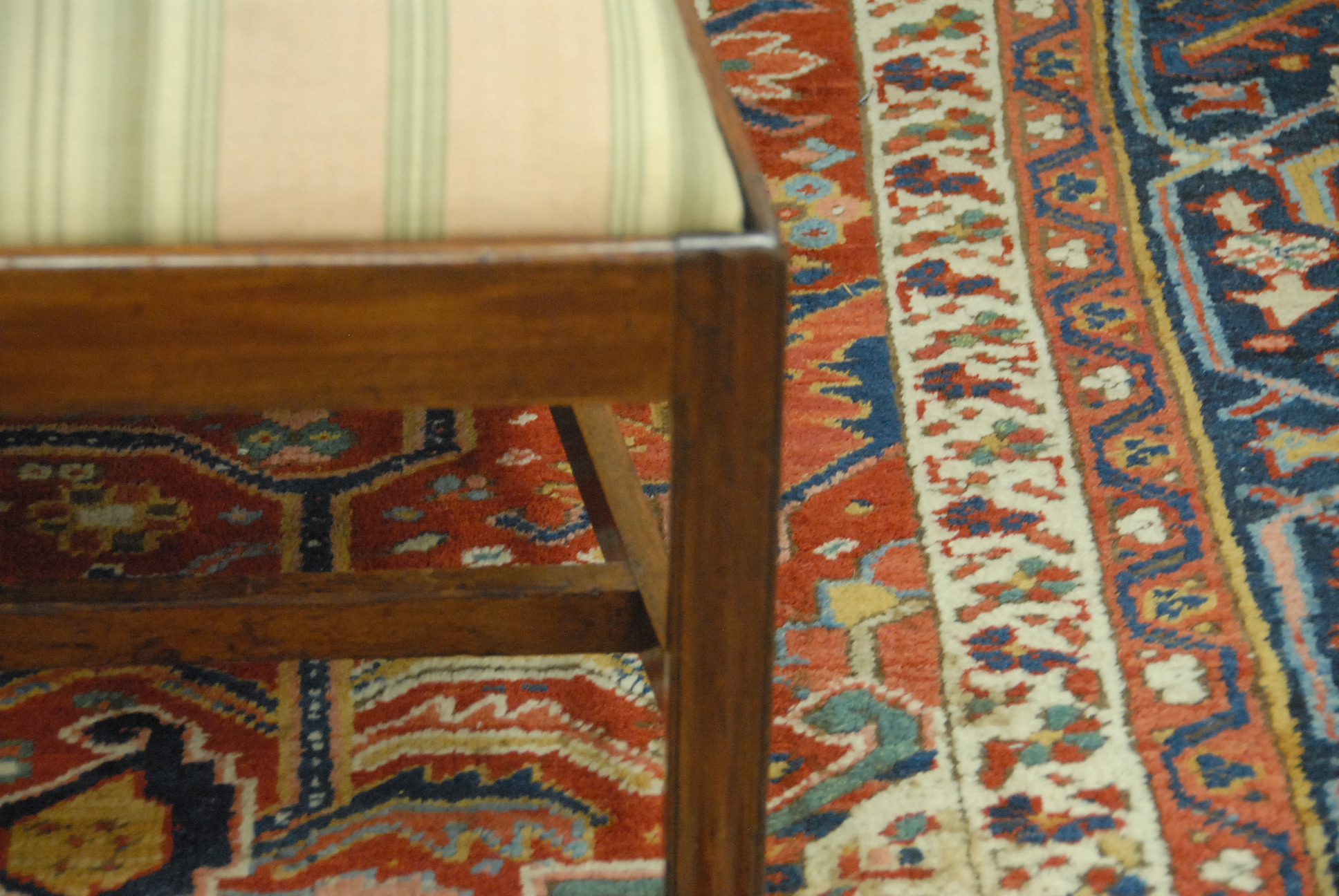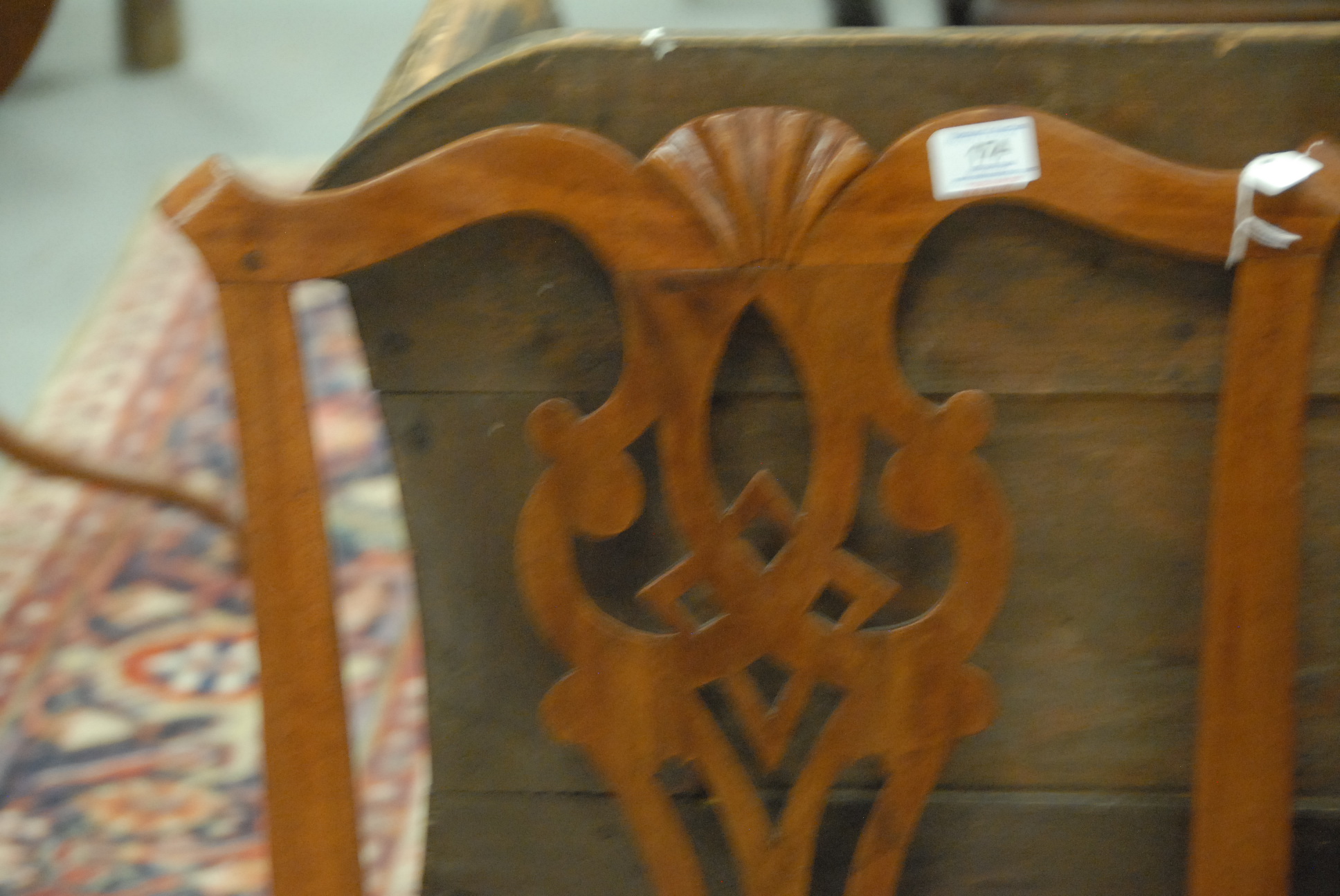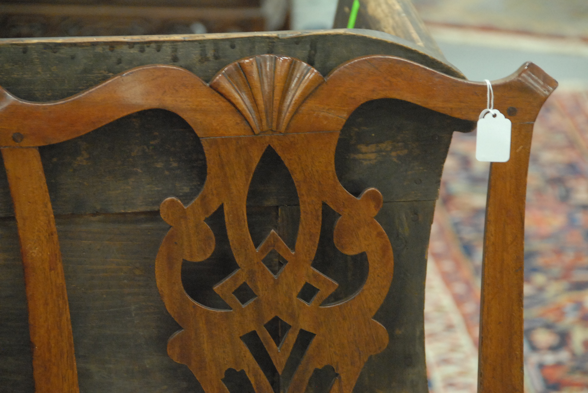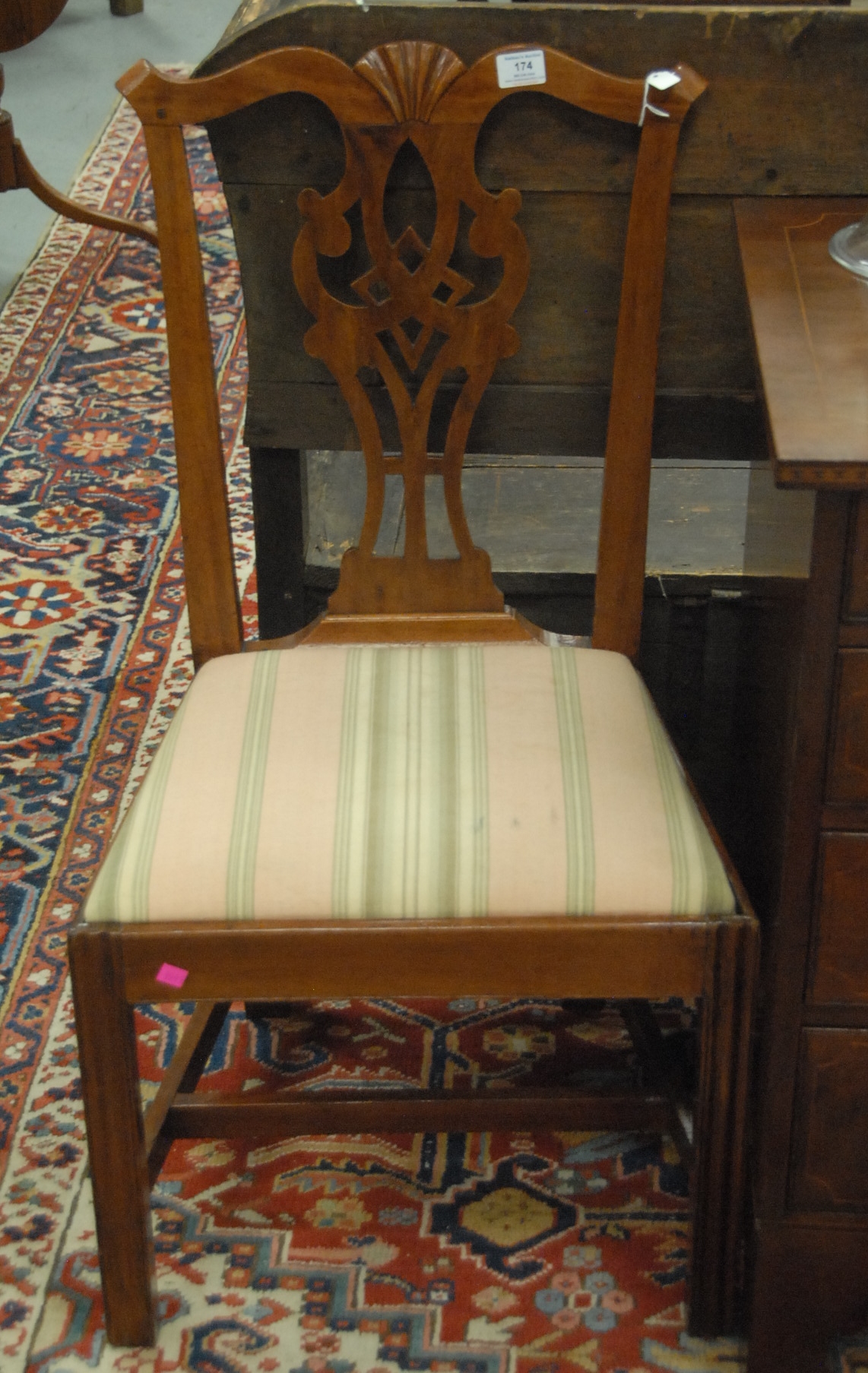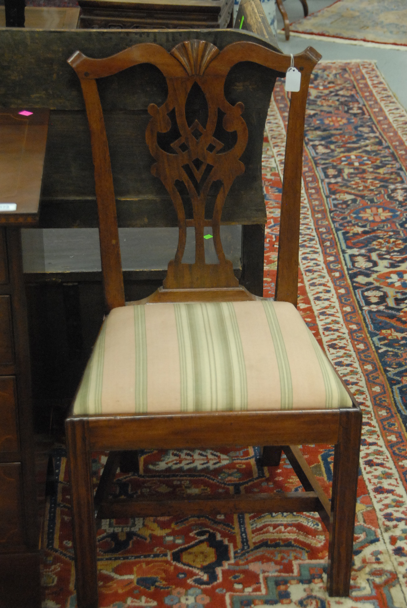 Lot 174: Pair of Chippendale mahogany side chairs with carved fans on serpentine top rail over pierced carved backs with upholstered slip seats on molded square legs with stretchers, circa 1780. seat ht. 16 3/4 in.