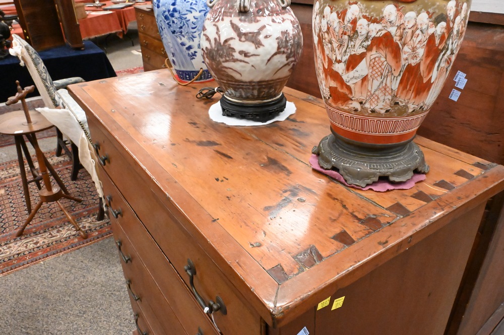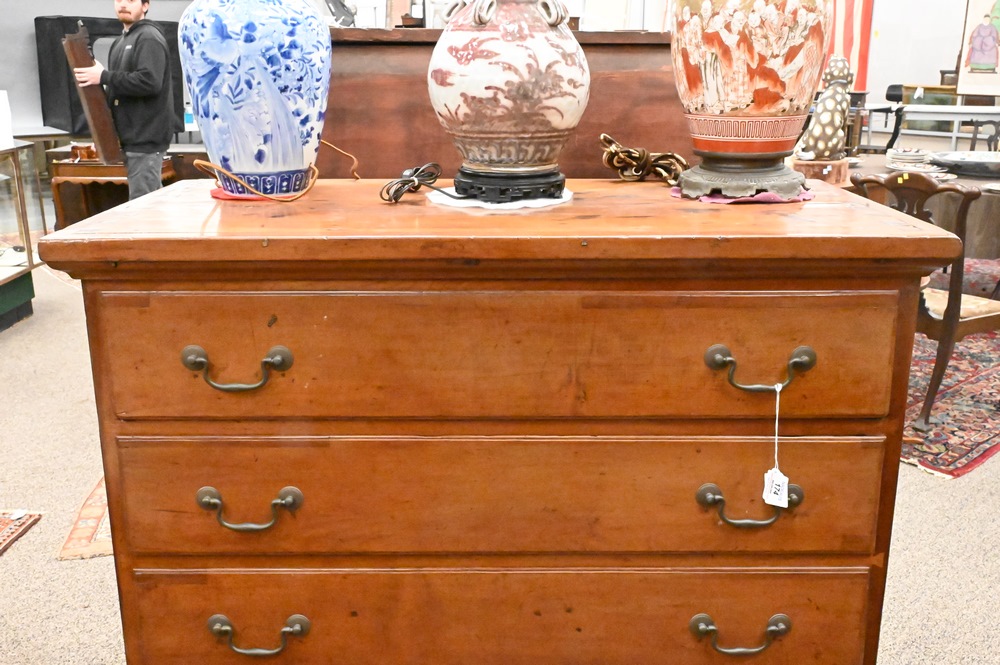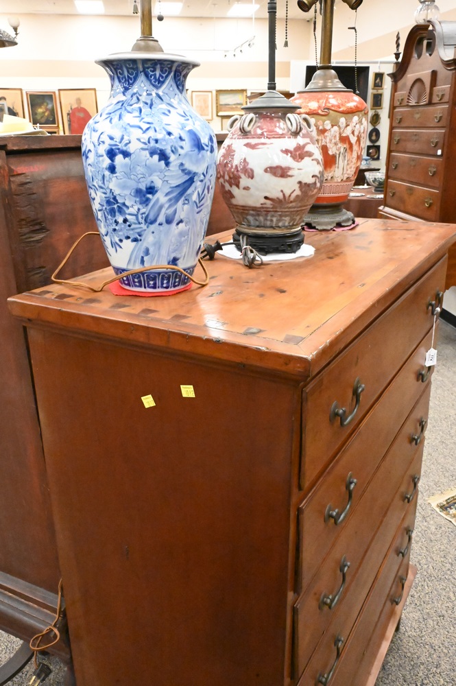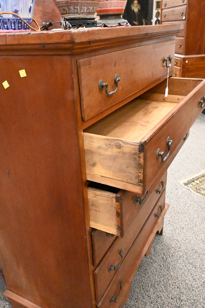 Lot 174: Queen Anne Cherry Tall Chest, having cornice molding over six drawers, bail handles over highly scalloped skirt, set on boot jack ends, circa 1750, height 51 inches, width 36 inches. Provenance: Estate of Florence Yannios, Waterfront Home, Guilford, CT.