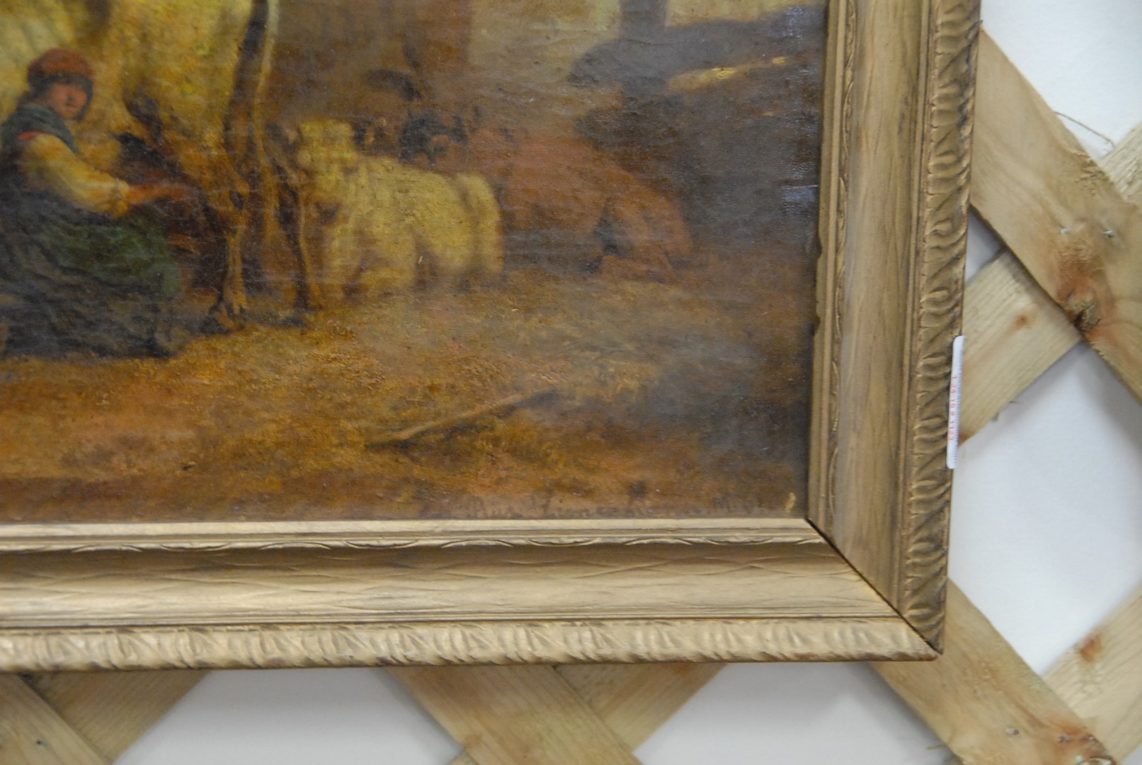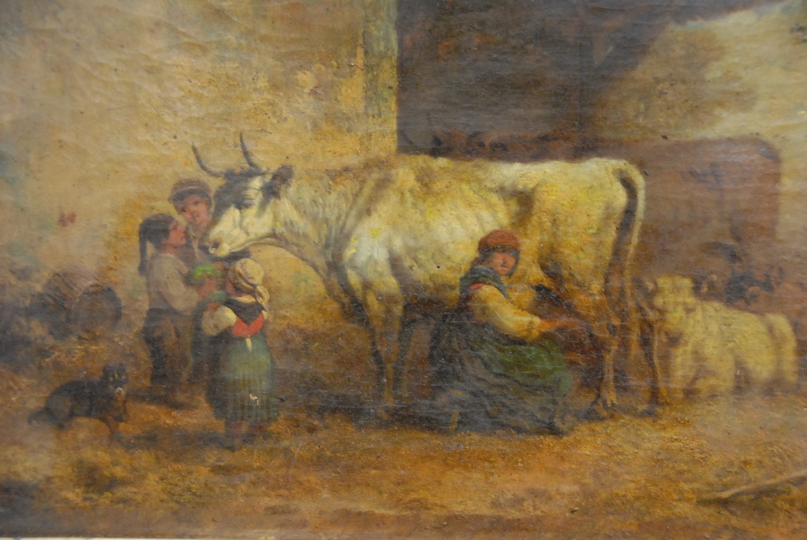 Lot 174: Rus Zimermann interior barn scene with cows, oil on canvas singed lower right Rus Zimermann. 11 x 17