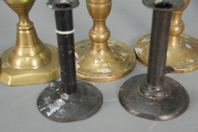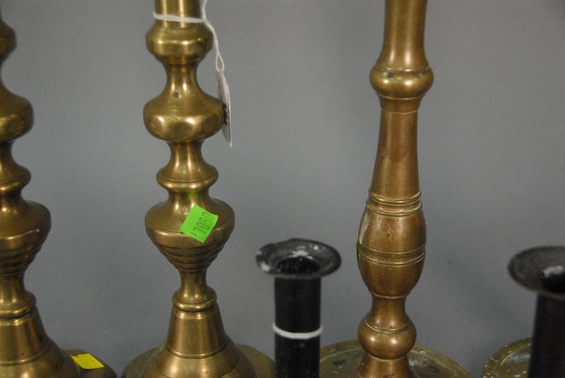 Lot 174: Six candlesticks including two pairs and two hog scrapers, ht. 7in. – 12in.