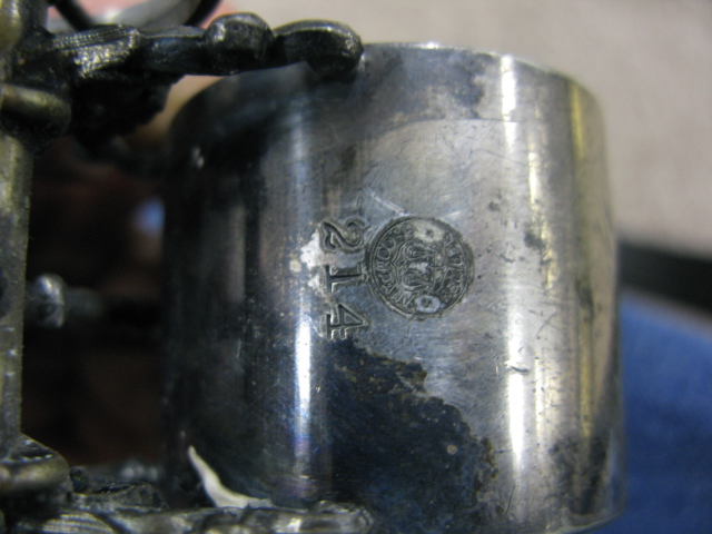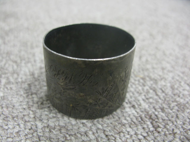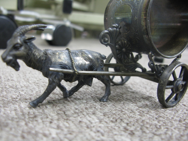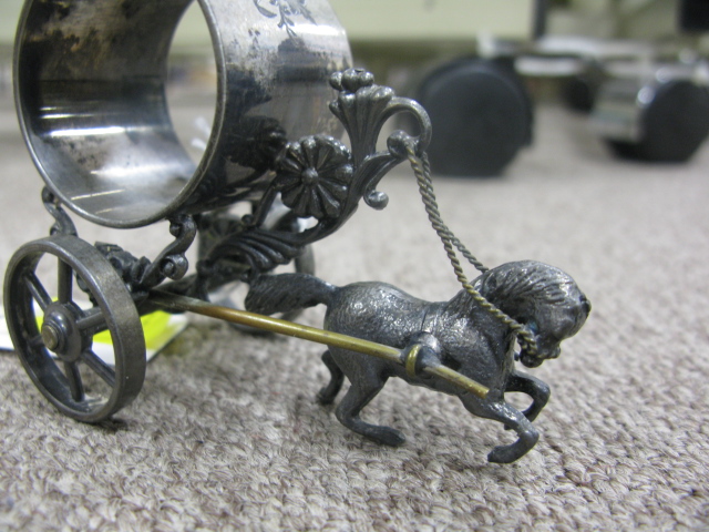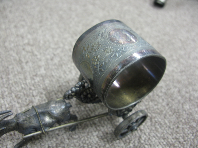 Three napkin rings, 2 with figures pulling carts one is goat pulling cart and other is horse pulling cart.