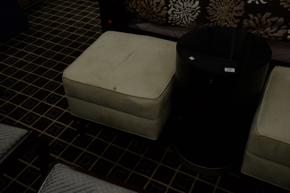 Lot 174: Three Piece Lot, to include a pair of beige square suede ottomans having castors, along with a circular side table having a glass to…