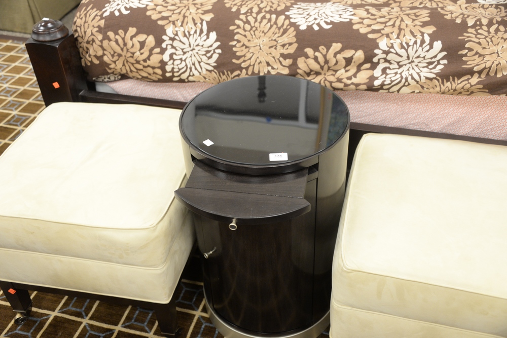 Three Piece Lot, to include a pair of beige square suede ottomans having castors, along with a circular side table having a glass top and one pull out slide over one door, height 19 inches, ottoman top 20″ x 20″, Provenance: David and Cynthia Kim, 22 Stoney Wylde Lane, Greenwich, Connecticut. View home by visiting: https://www.zillow.com/homedetails/22-Stoney-Wylde-Ln-Greenwich-CT-06830/177238281_zpid/.