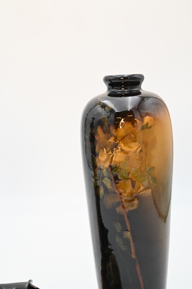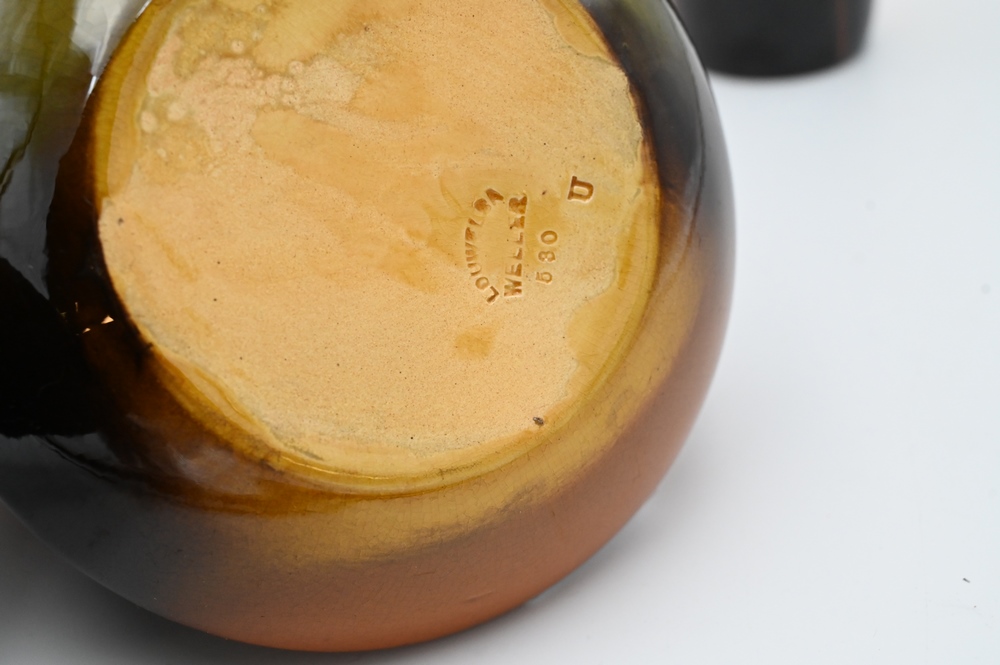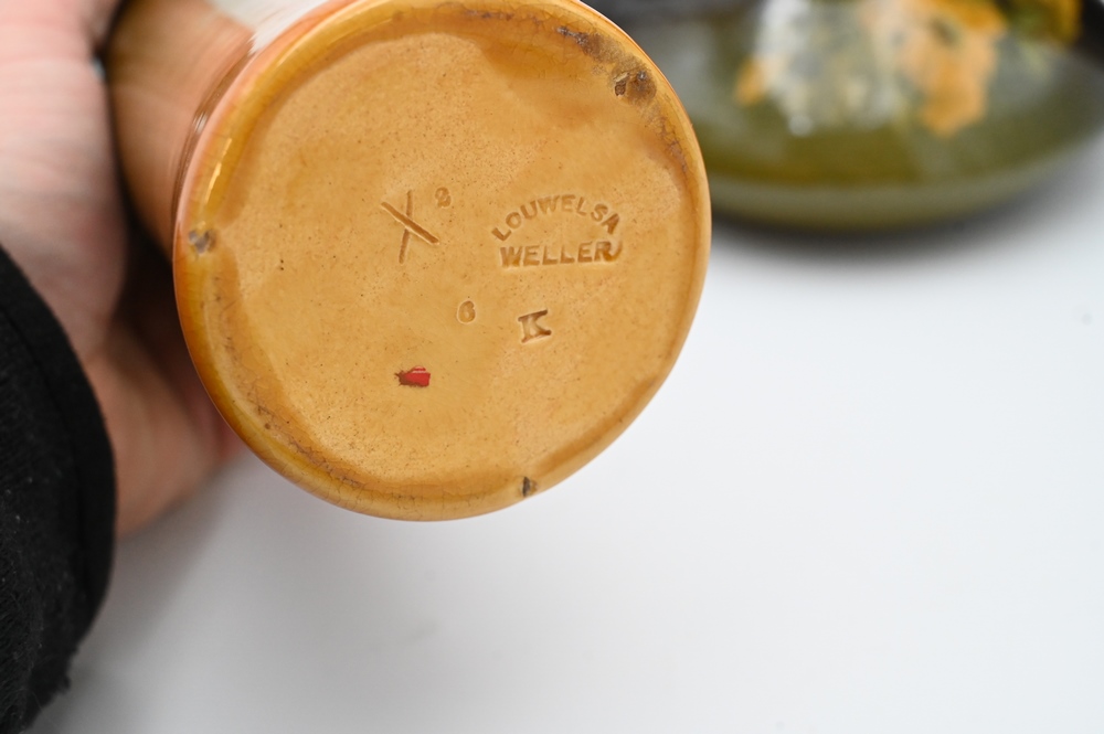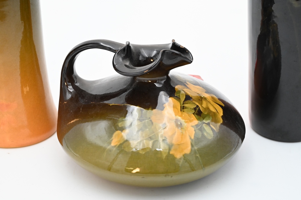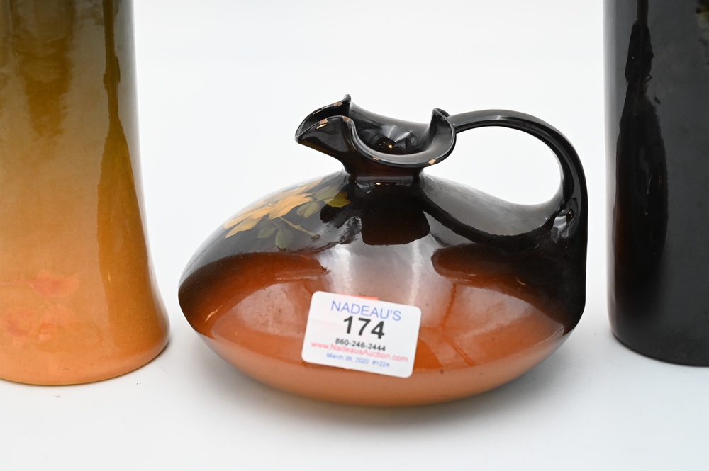 Lot 174: Three Piece Louwelsa Weller Art Pottery Group, to include two tall vases, 12 and 12 1/2 inches; along with an ewer, 4 inches.