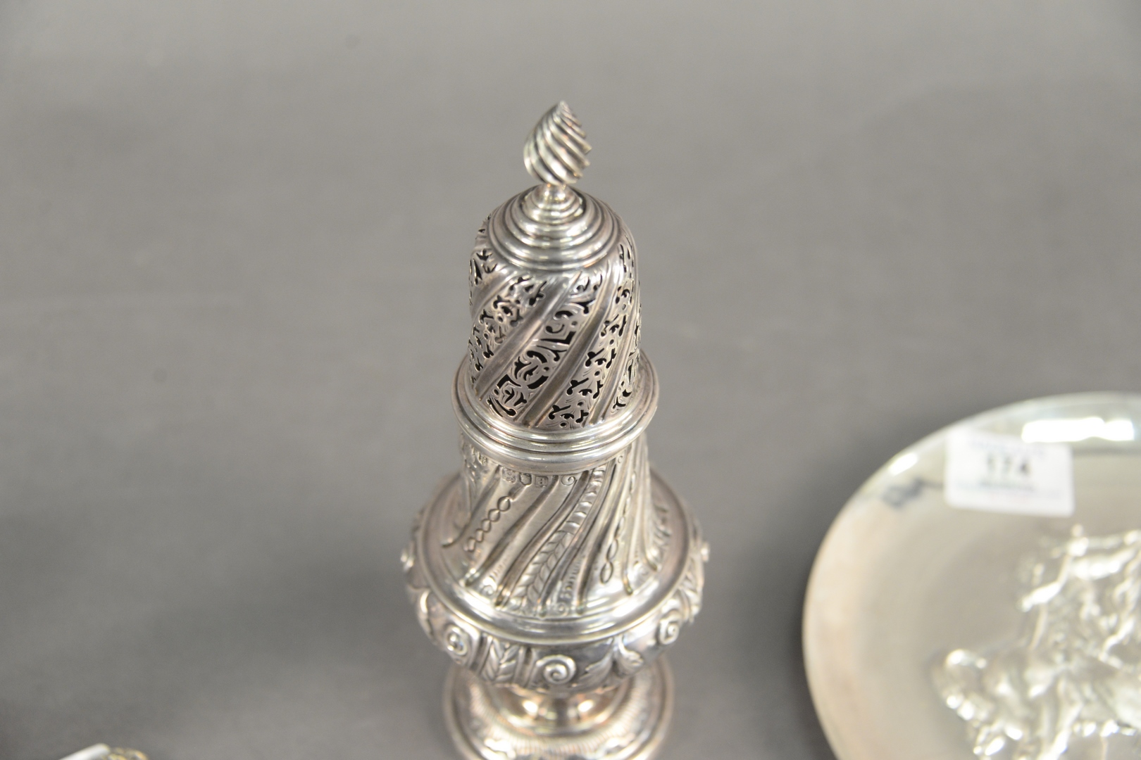 Two Piece Silver Lot, to include an English silver caster and a sterling silver Lincoln Mint 1971 plate, “Unicorn Dyonisiaque” initialed by Salvador Dali, 14 t.oz.