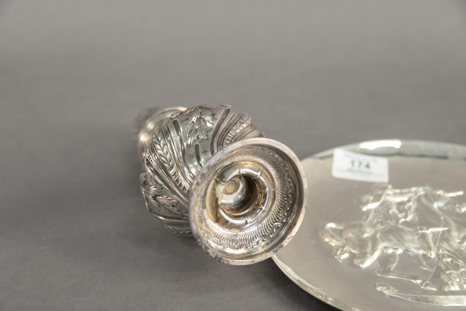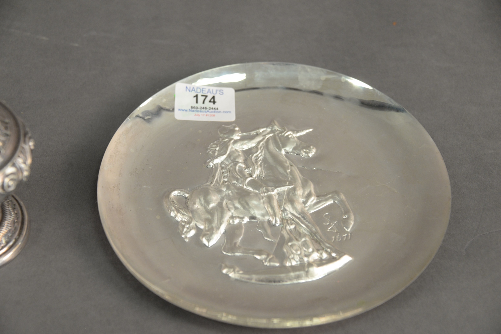 Lot 174: Two Piece Silver Lot, to include an English silver caster and a sterling silver Lincoln Mint 1971 plate, “Unicorn Dyonisiaque” initialed by Salvador Dali, 14 t.oz.