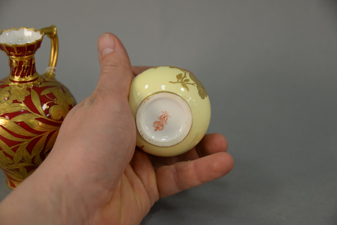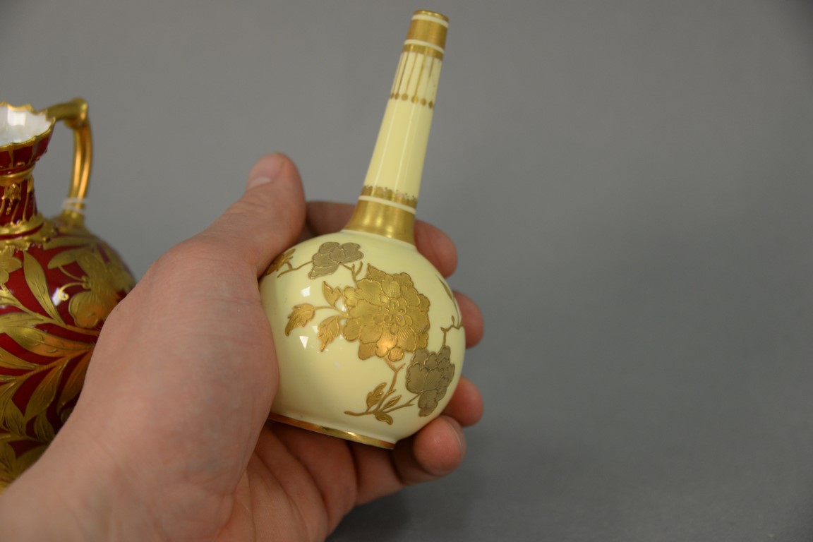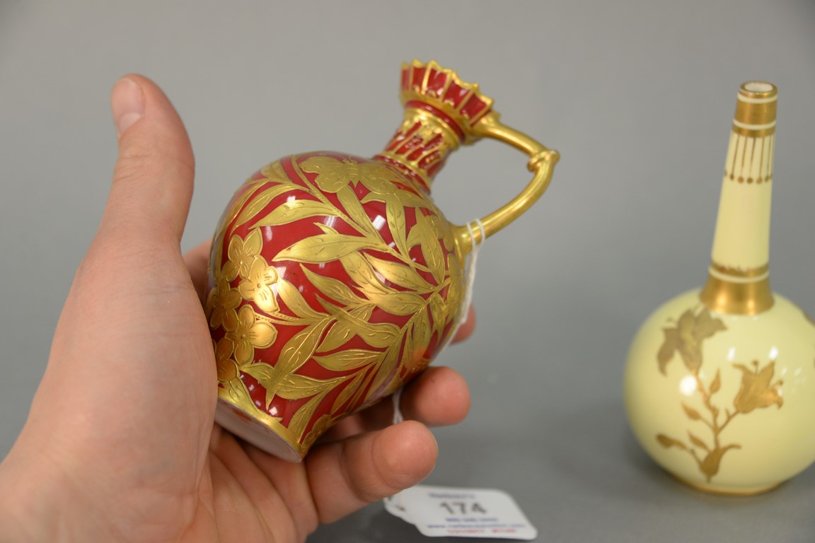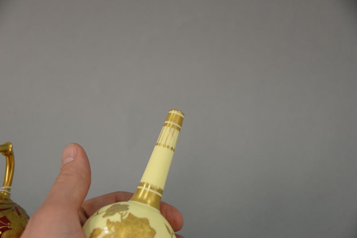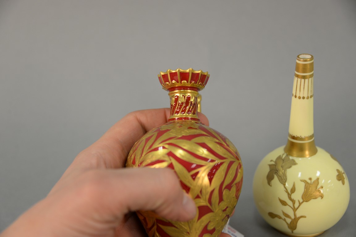Lot 174: Two Royal Crown Derby porcelain vases, 19th century, one having red ground decorated with gilt flowers and leaves and the other yell…