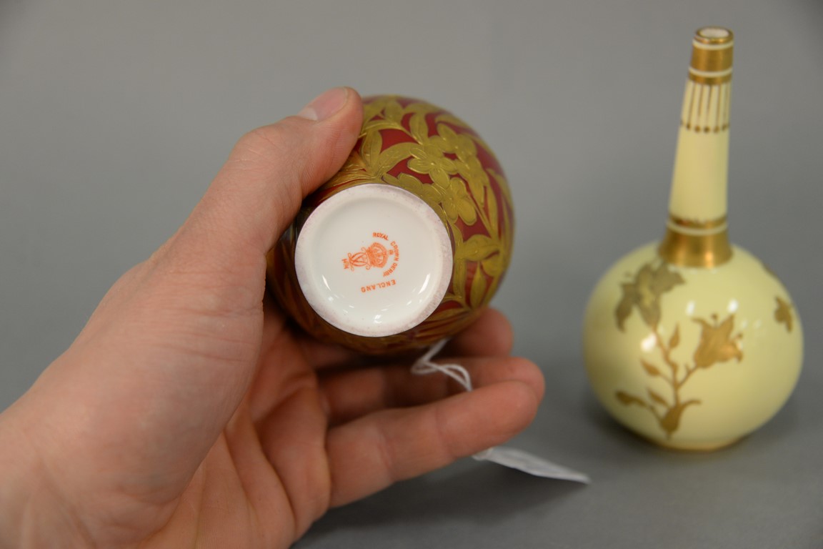 Two Royal Crown Derby porcelain vases, 19th century, one having red ground decorated with gilt flowers and leaves and the other yellow with gilt decoration. ht. 4 1/2in. & 4 3/4in.