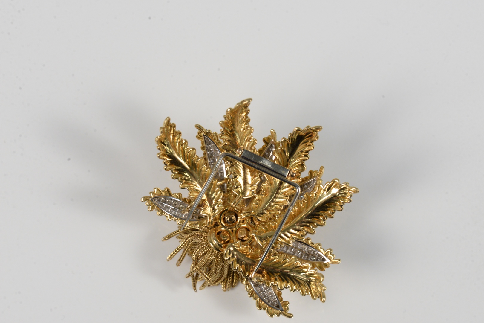 Lot 175: 18 Karat Gold Leaf-Style Brooch six fern leaves set with diamonds and gold tassels, approximately one hundred fourteen diamonds widt…