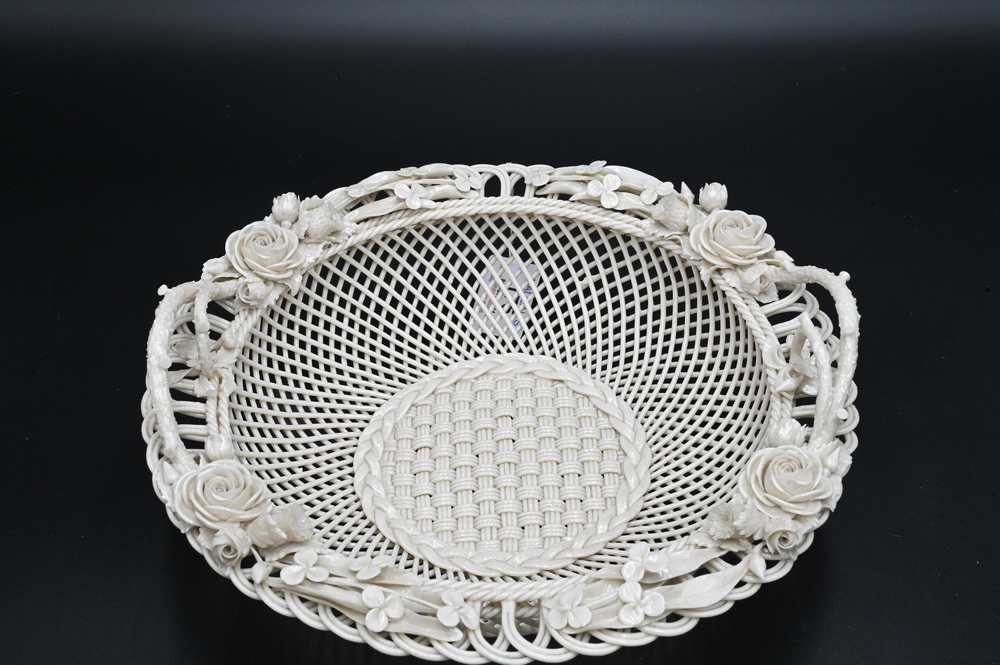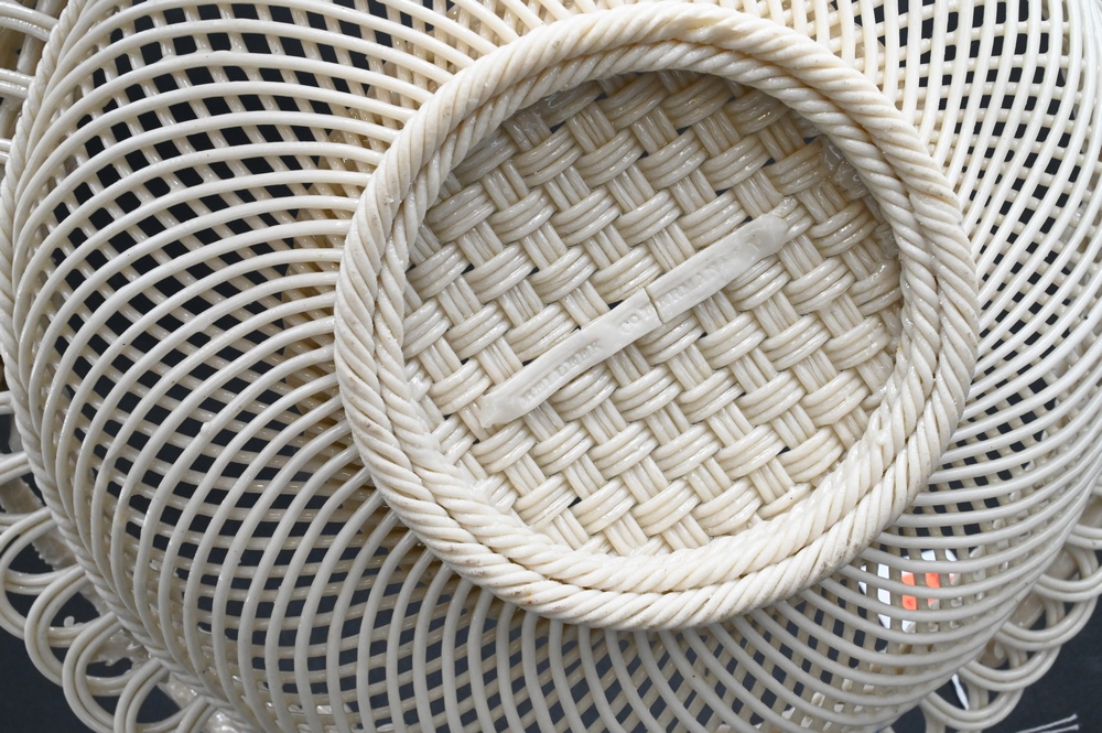 Lot 175: Belleek Porcelain Handled Basket, three strand, basket with flowers and twig handles, impressed mark on bottom, diameter 11 inches. Provenance: Collections of Norma Reilly, New Jersey.
