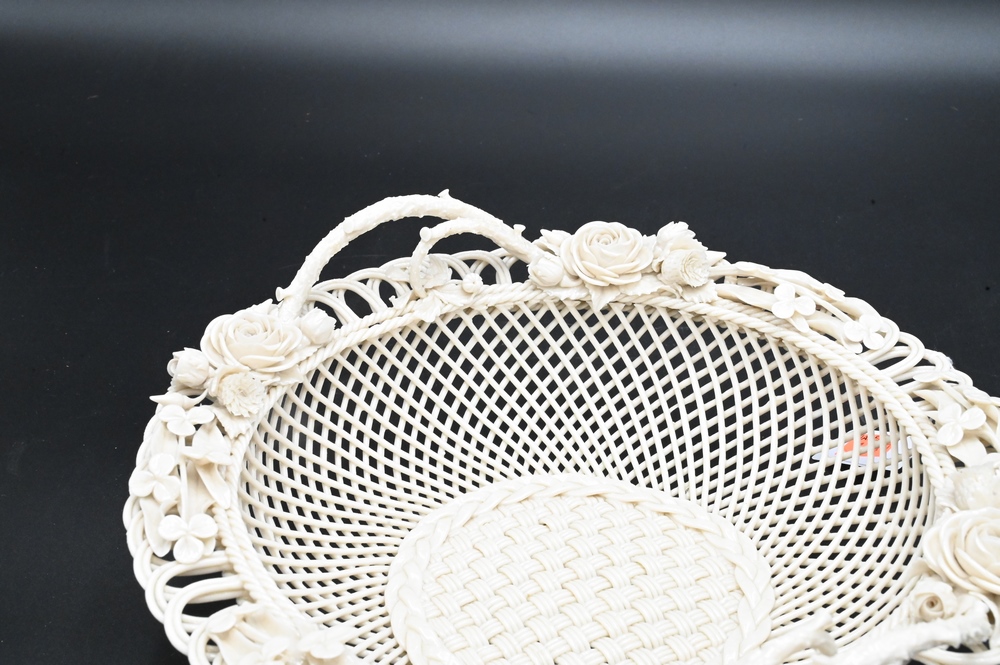 Belleek Porcelain Handled Basket, three strand, basket with flowers and twig handles, impressed mark on bottom, diameter 11 inches. Provenance: Collections of Norma Reilly, New Jersey.