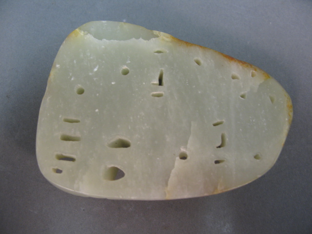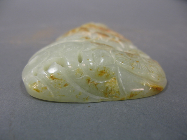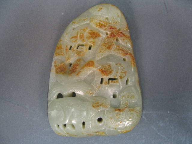Carved jadeite celedon with russet spots, carved in the form of a scenic view with trees and animals