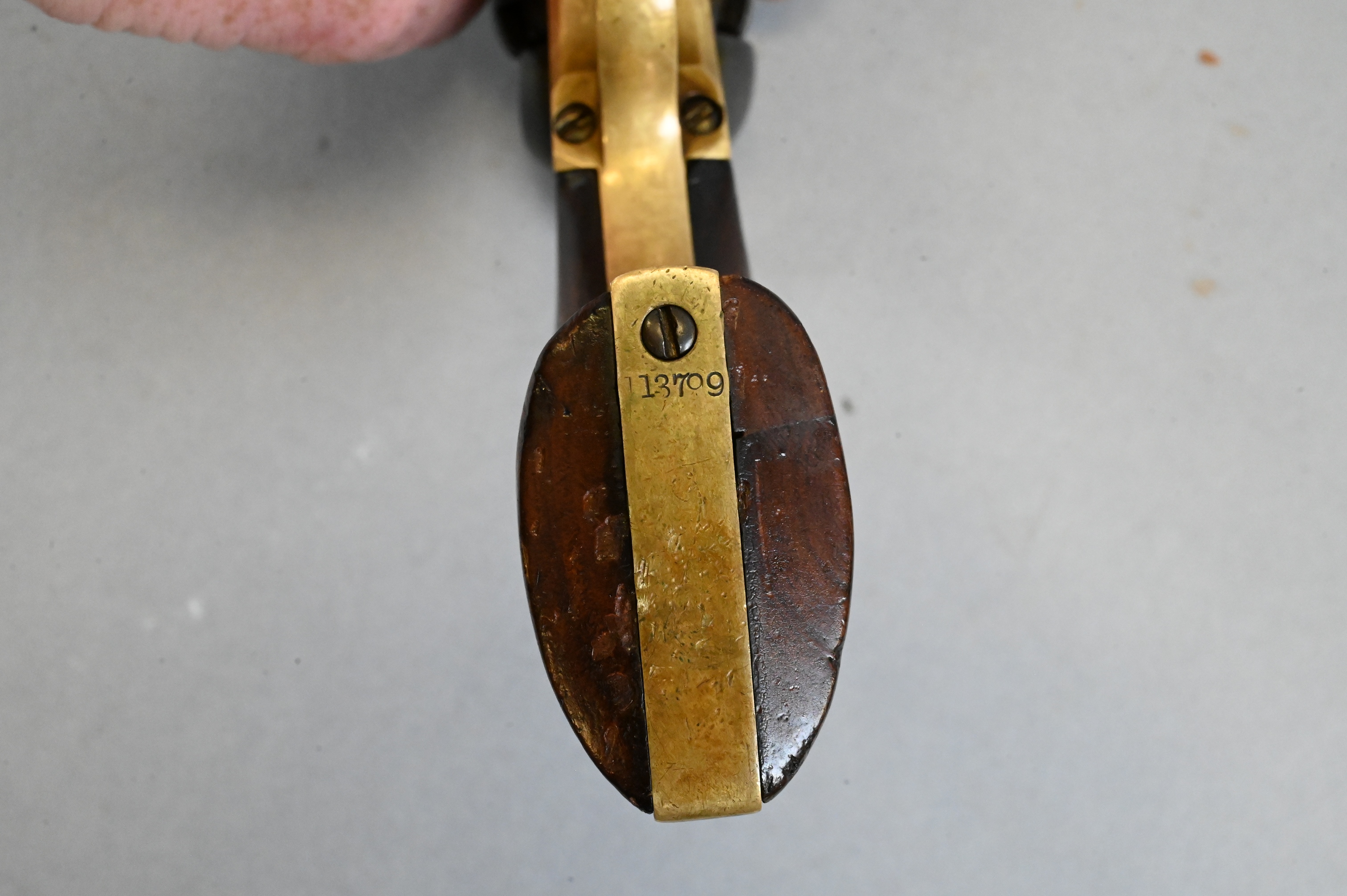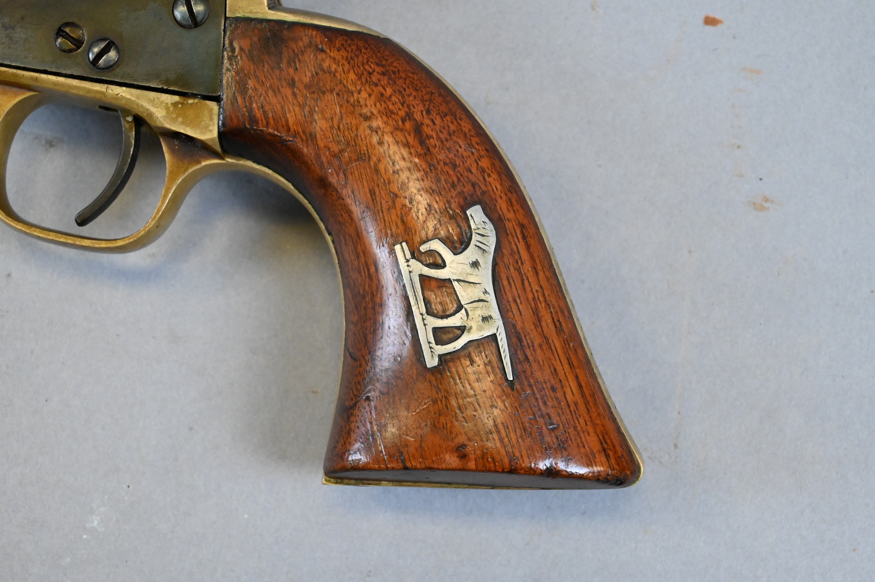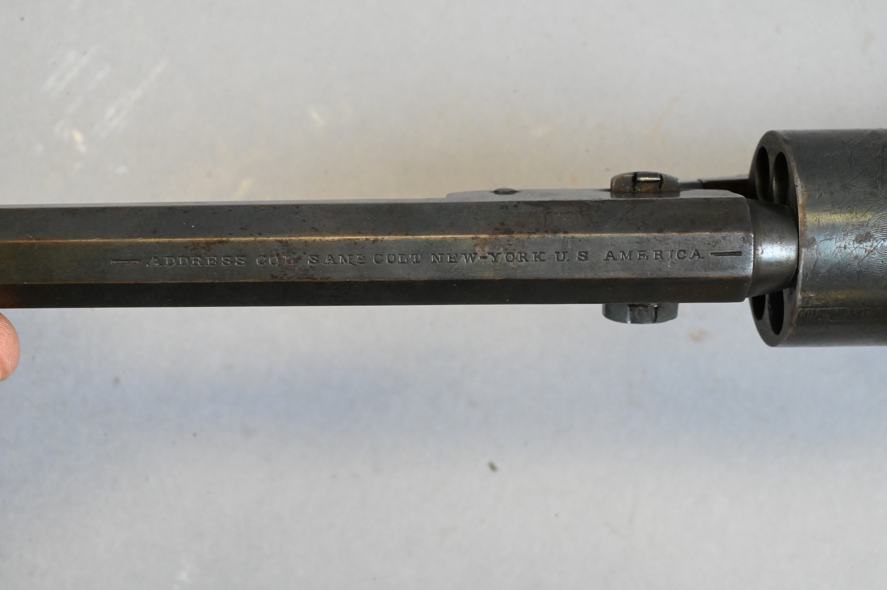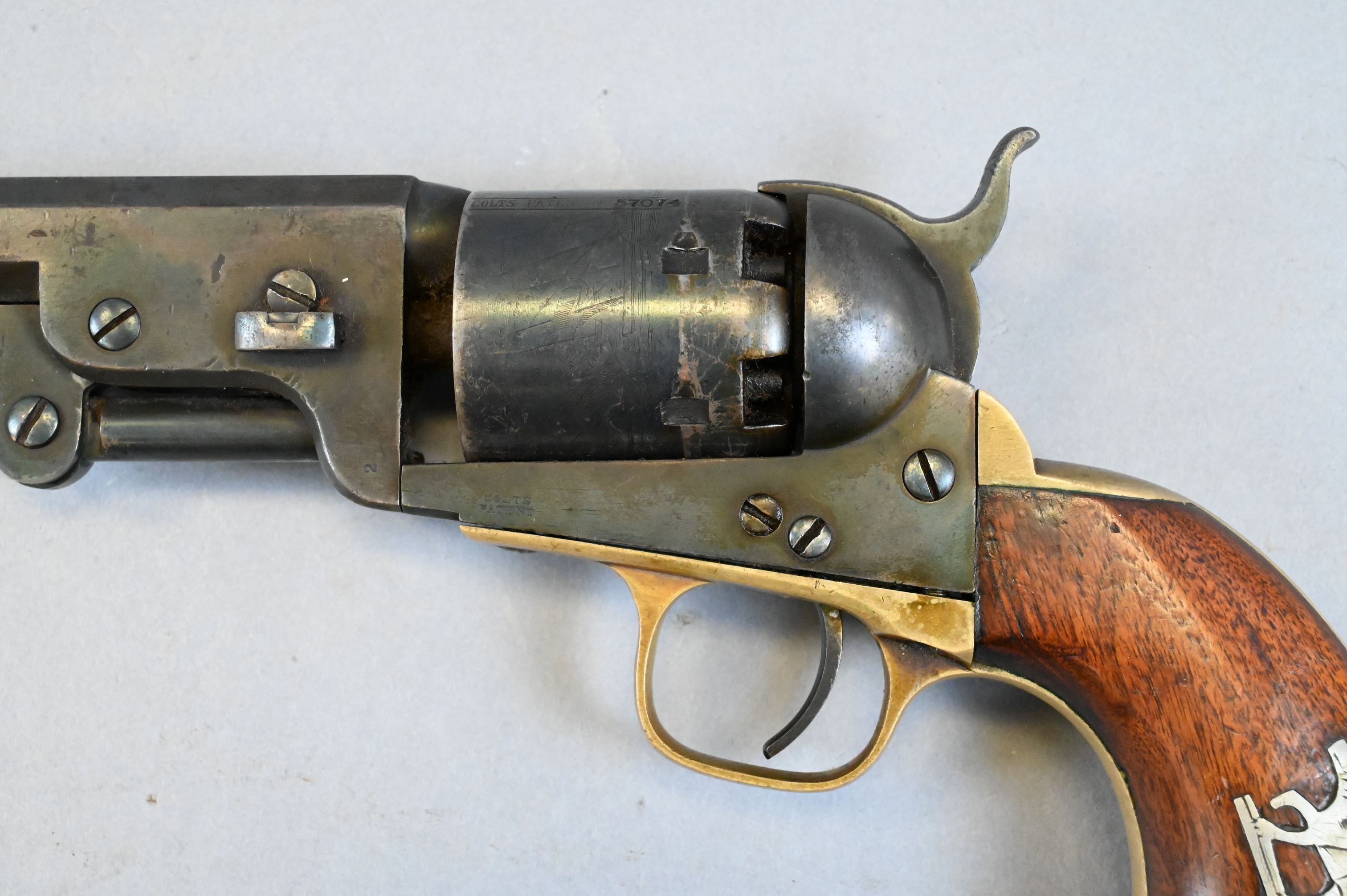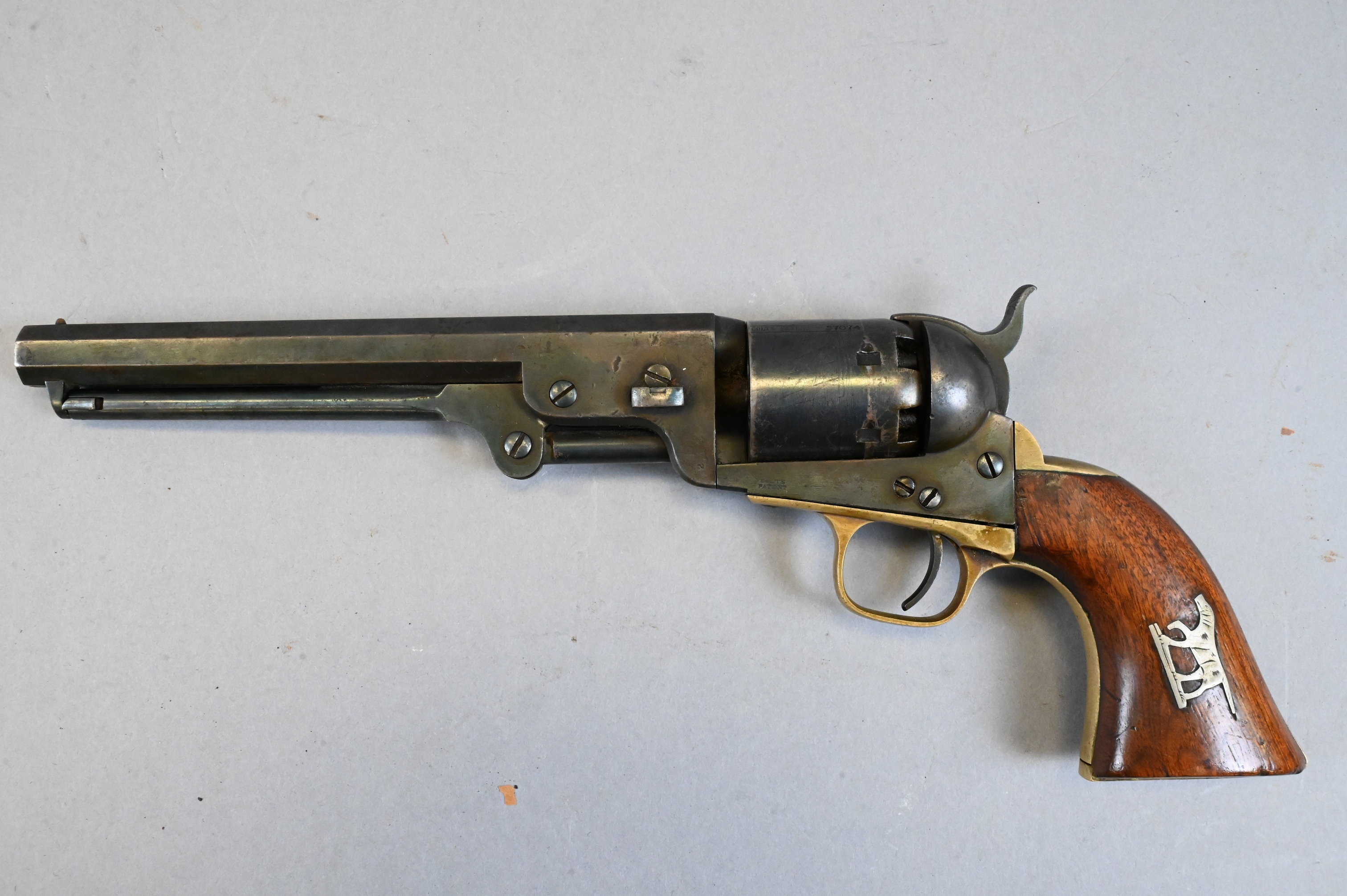 with naval engagement on cylinder and octagonal barrel, serial number 113799 (manufactured in 1861) on strap, barrel, and frame, non matching cylinder serial number 57074 wooden grips inlaid with dog on one side and oval cartouche on the other, back strap engraved “Presented to Captain G.W. Stackhouse/ By his company Rest N.Y.S.V.”, cylinder engraved with sailing ships