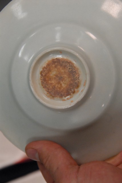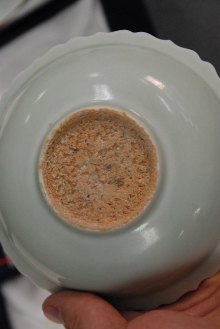 Crackle glazed rams vase having front and back views of 3 rams sitting on 6 legs with flared rim