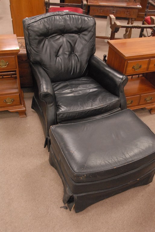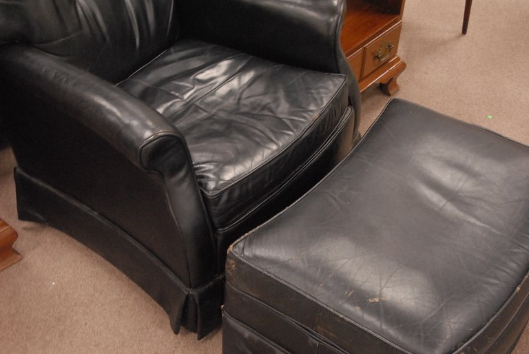Dark charcoal grey leather reclining chair and ottoman.