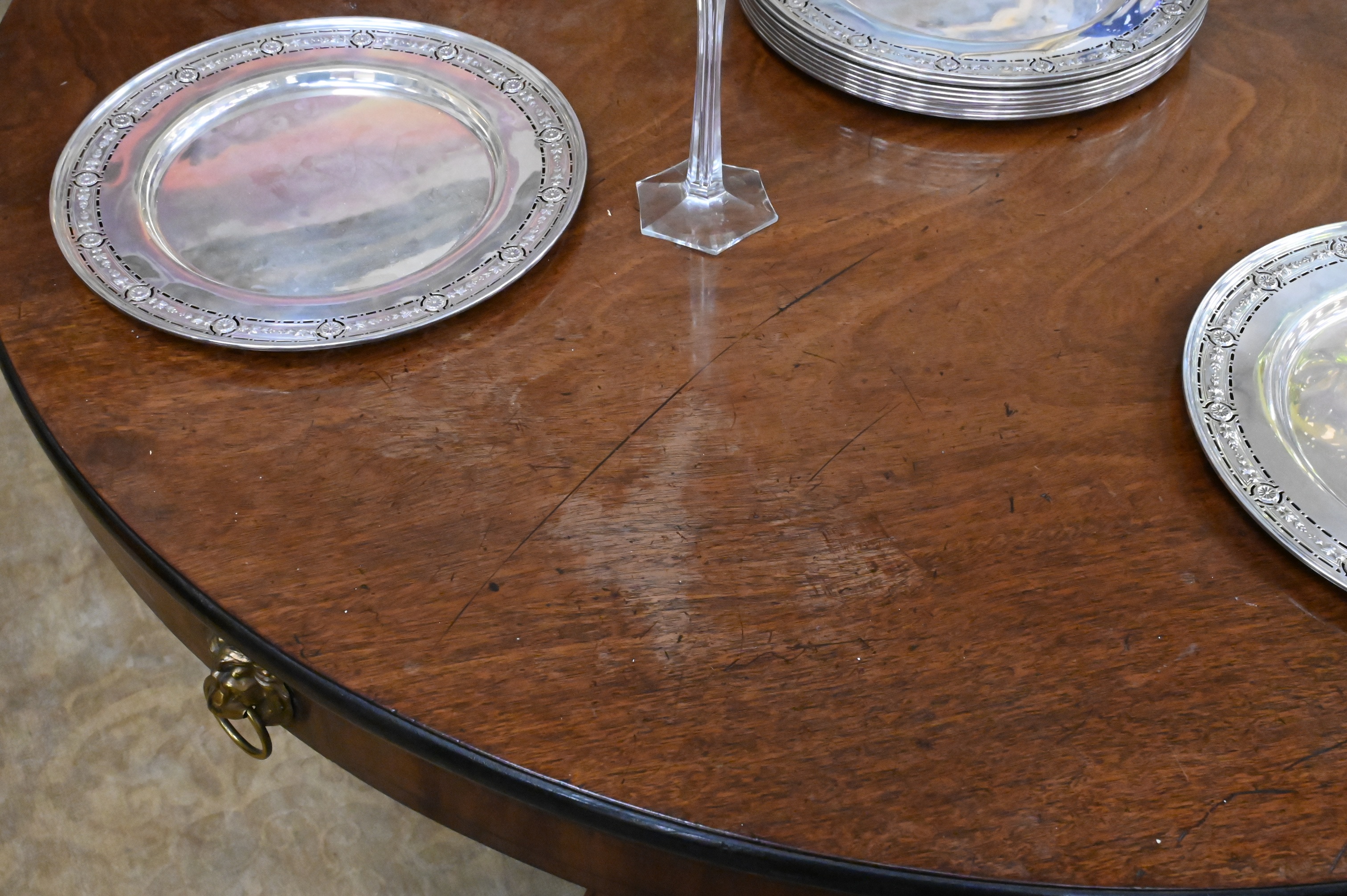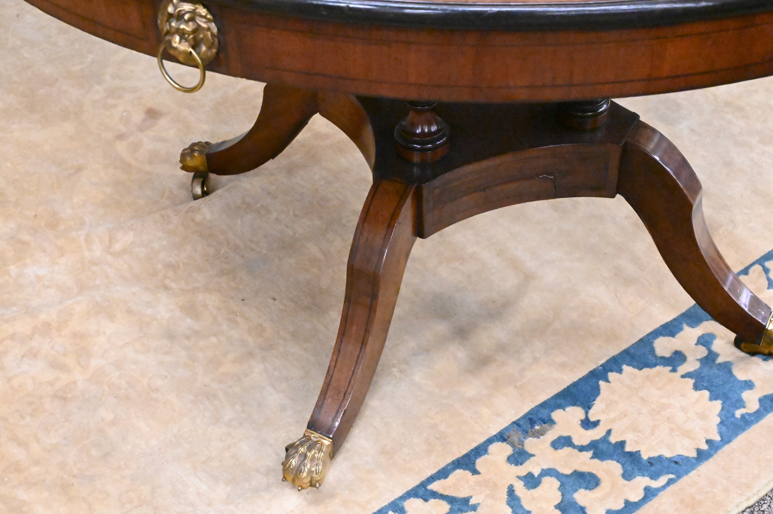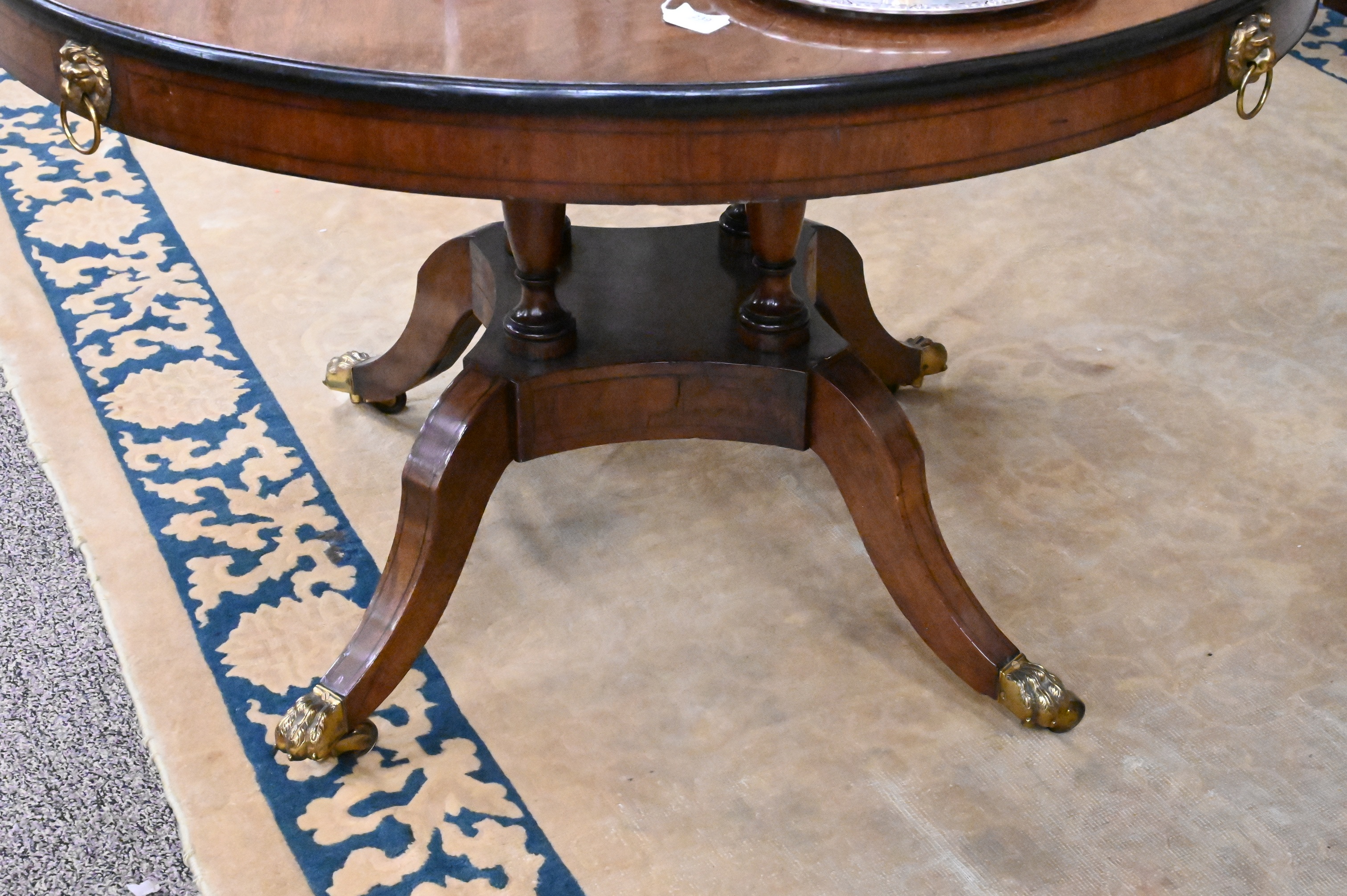 having circular top with molded edge above a plain frieze fitted with brass lion’s head ring pulls, raised on a turned and faceted support with four splayed legs terminating in brass paw feet and castors, top tilts on a brass latch mechanism, early 19th century