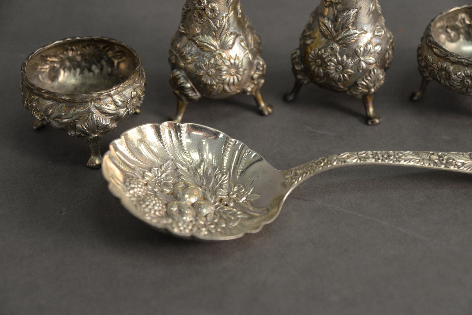 Lot 175: Five Piece Kirk & Sons Sterling Silver Repousse Lot, to include two open salts, two pepper shakers, one fruit spoon, (pepper shakers dented on bottoms), 13.5 t.oz.