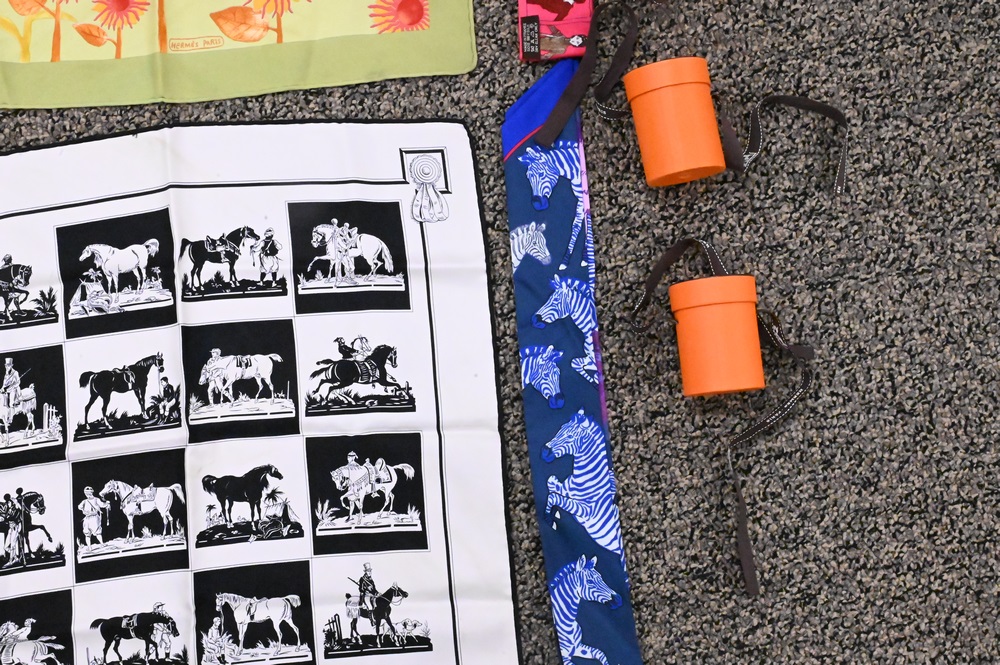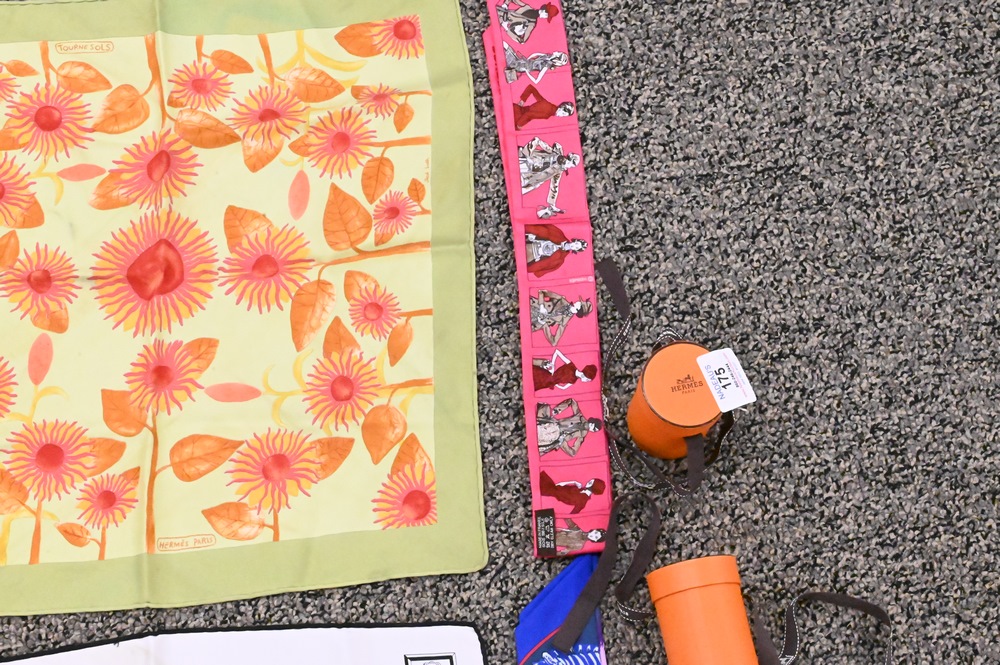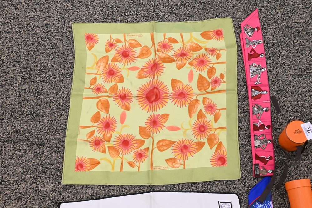 Lot 175: Four Piece Hermes Group, to include two silk ascots with round container; a silk Tournesols handkerchief with box; along with a blac…