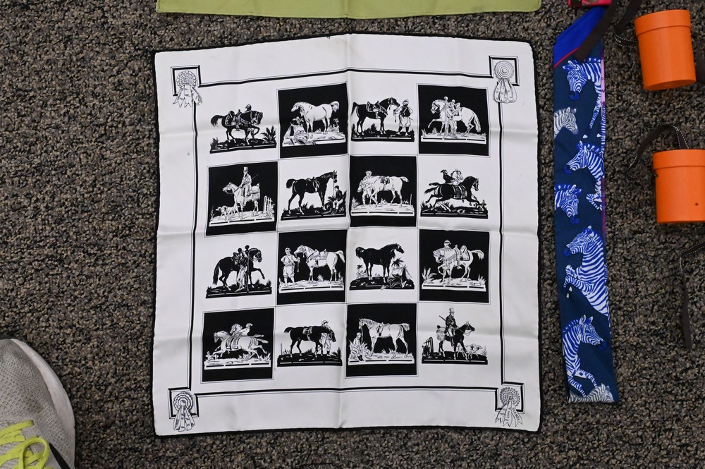 Four Piece Hermes Group, to include two silk ascots with round container; a silk Tournesols handkerchief with box; along with a black and white equestrian handkerchief with box.
