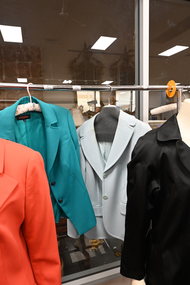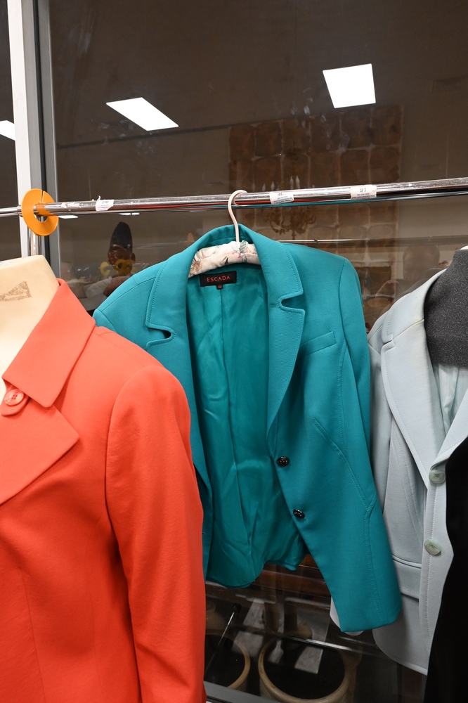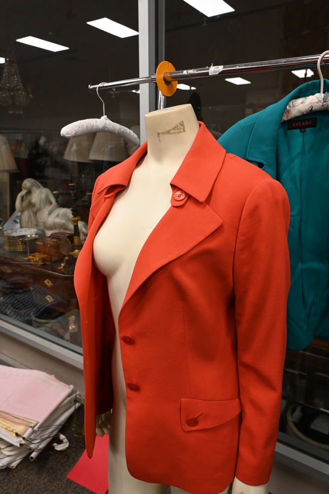 Lot 175: Four Piece Lot of Escada Blazers, along with a black satin trench, to include double breasted trench coat; orange blazer; along with…