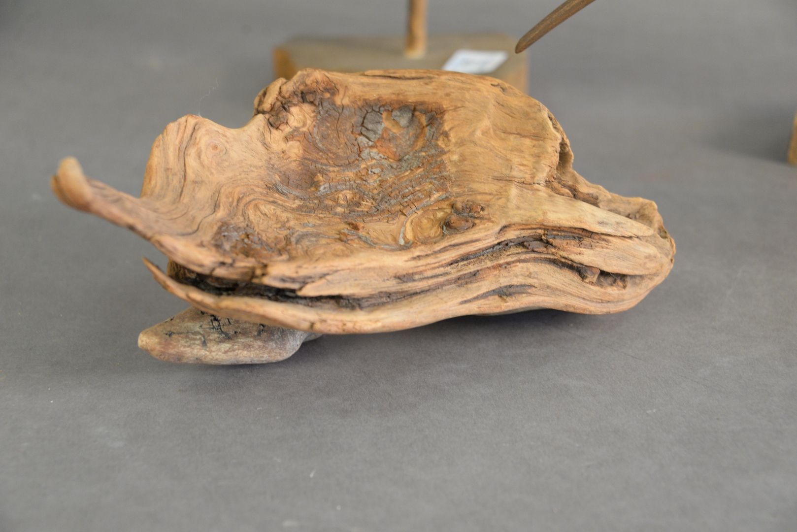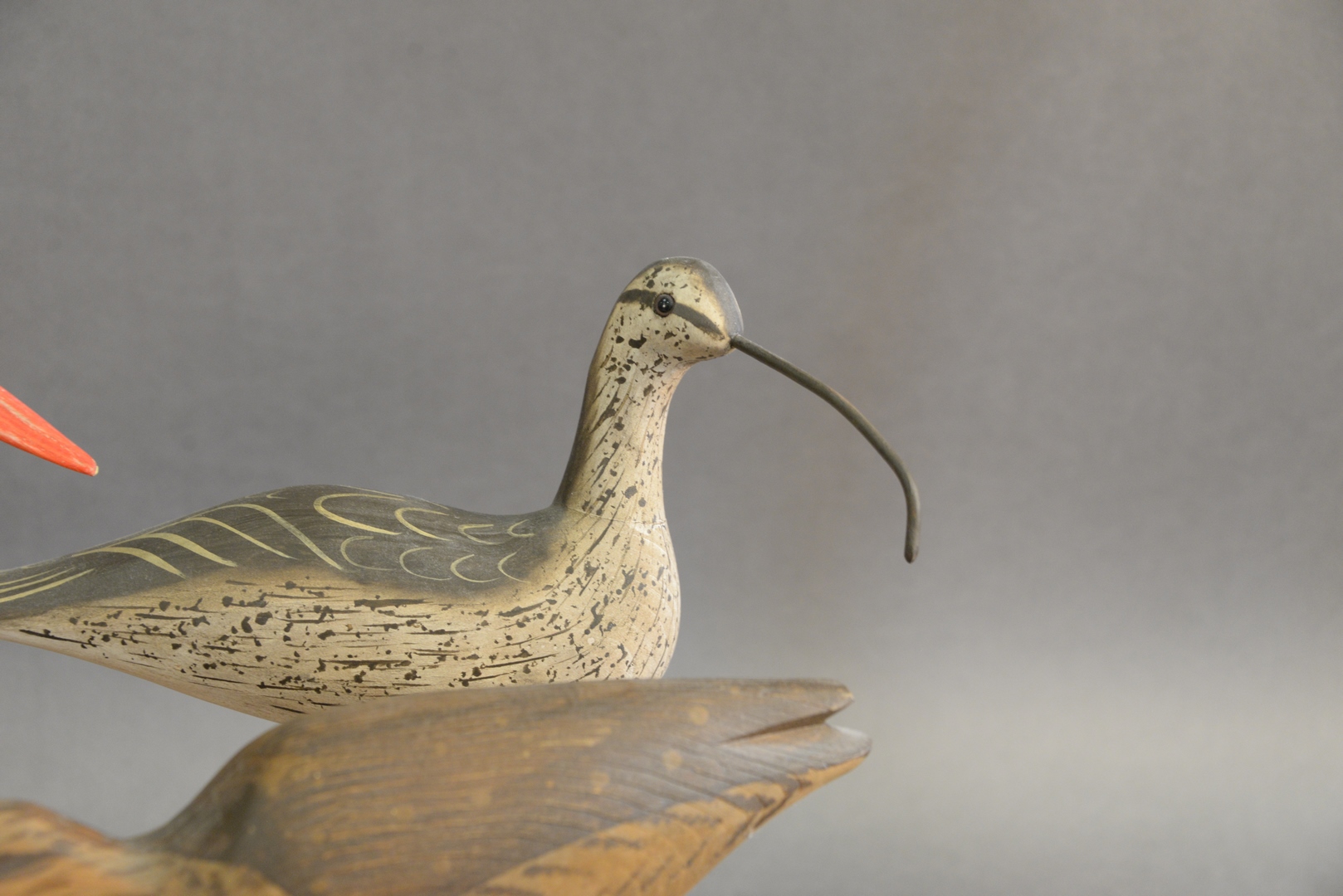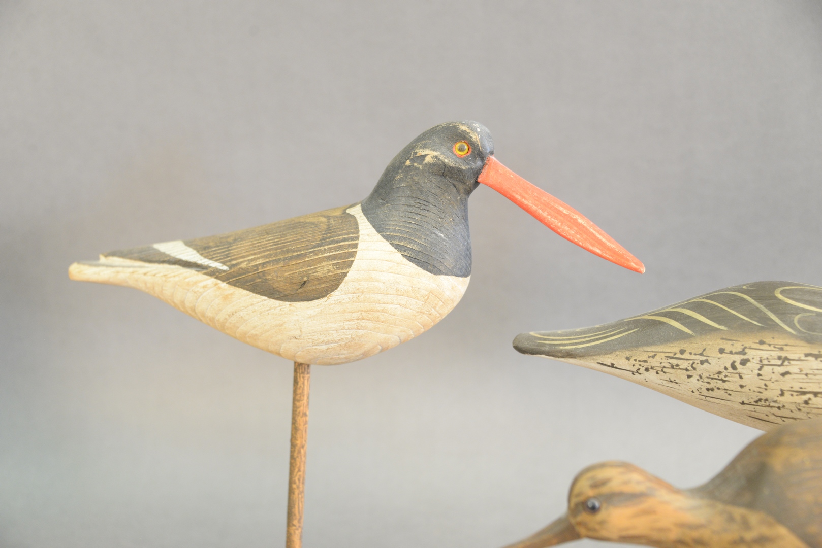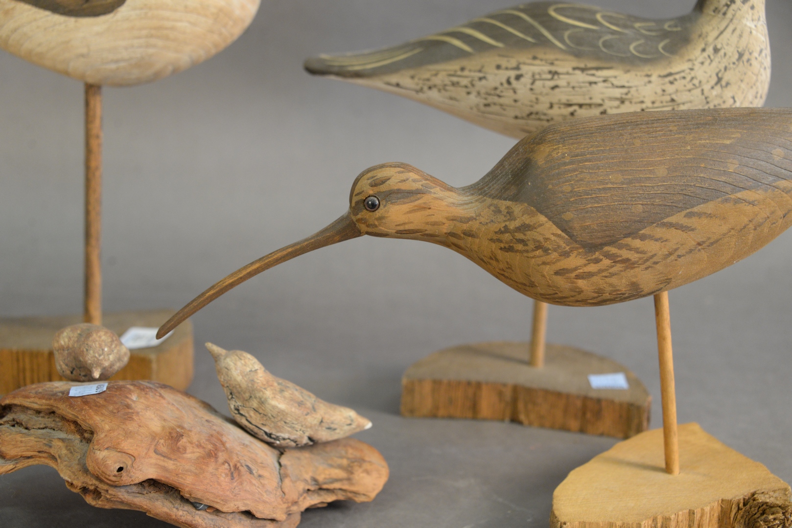 Lot 175: Four Piece Lot to include three shore bird decoys, along with one burlwood having two small birds, height 12 1/2 inches.